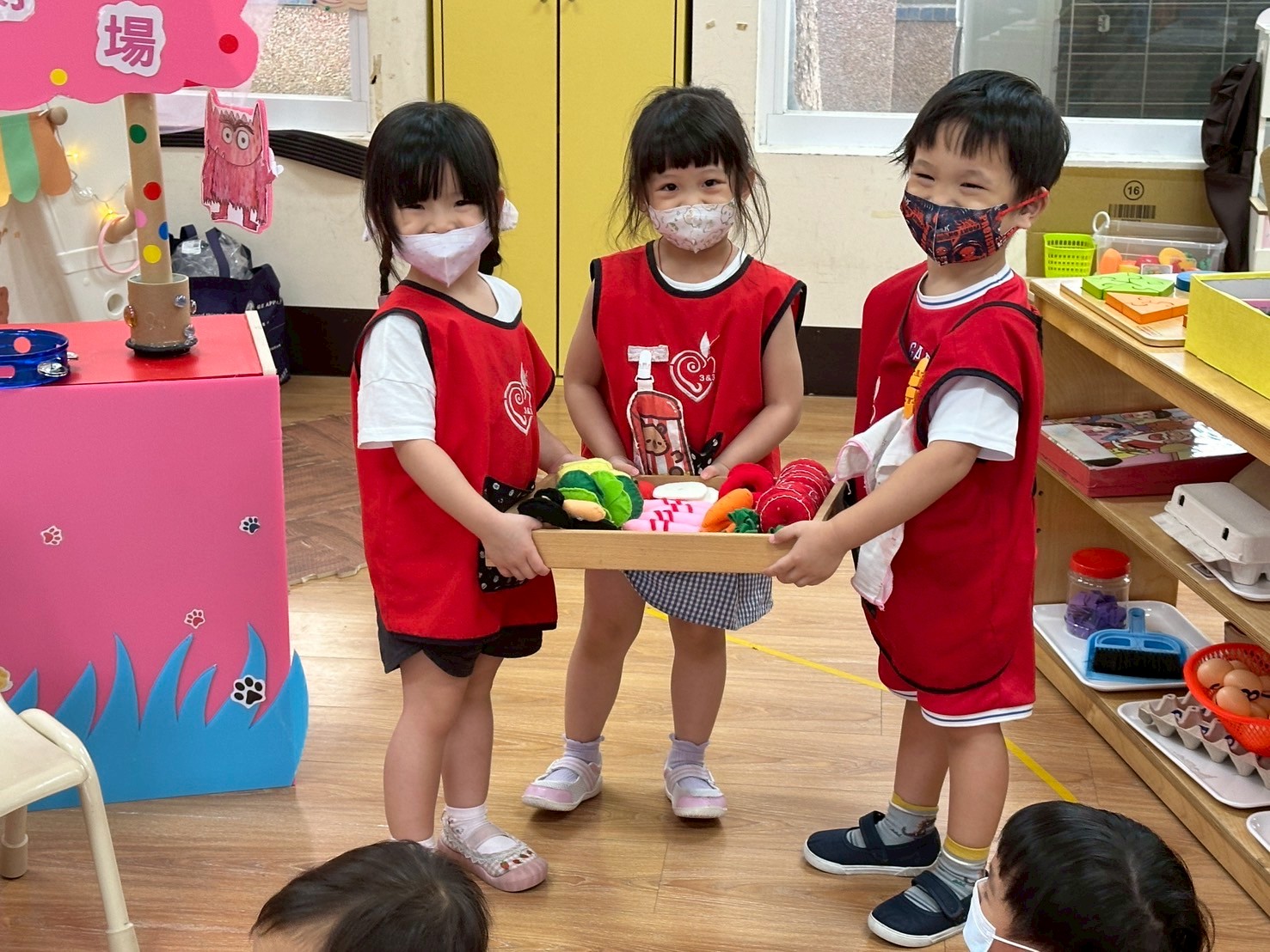孩子透過把彩色怪獸的顏色做成烤肉串,在操作的過程中學習數數與認識數量,並能將不同顏色組合起來,設計成套餐,練習分類與配對。延伸到麵店遊戲時,孩子能透過點餐、出餐的互動,表達自己的需求,並體驗角色扮演的樂趣。也延續麵店的遊戲,孩子們可以自由搭配套餐,練習表達需求與角色互動,在遊戲中自然體驗數量概念與生活語言。
