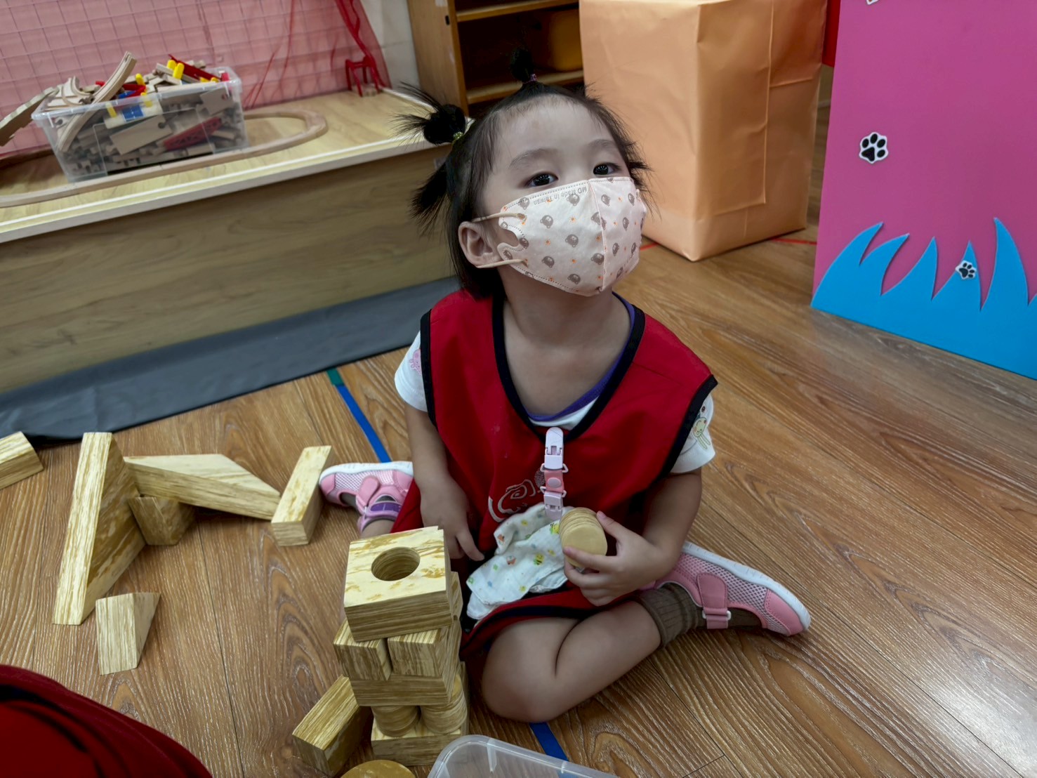 在積木區中,孩子們透過操作積木進行搭建與遊戲,能在嘗試中觀察到不同形狀的特徵,並逐漸培養對形狀的對應與辨識能力。藉由小怪獸的主題,孩子能將積木與形狀、顏色及數字概念做連結,在遊戲中自然地理解「數量」與「對應」的關係。過程中孩子不僅能練習專注力與手眼協調,也能在操作與分享作品時,培養合作與表達的能力,進而從中感受建構的樂趣與自我成就感。