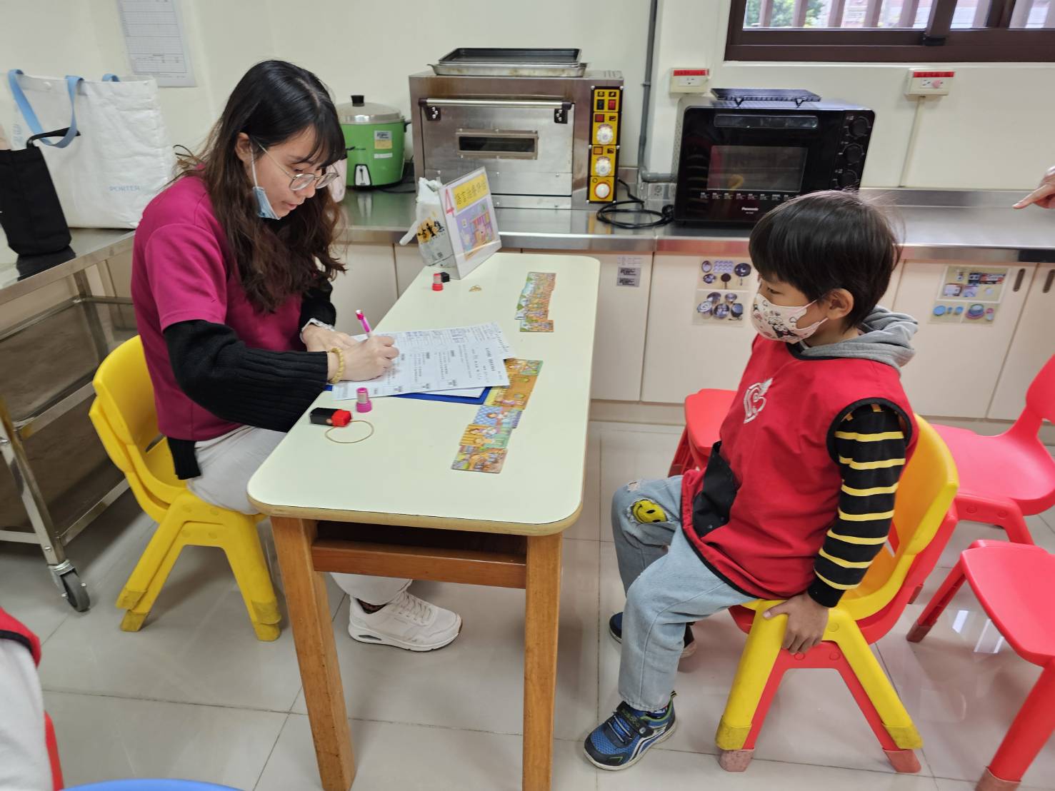 活動內容:結合社區醫療資源"中山醫藥大學語言與聽力治療學系",以專業的語言治療師與聽力系學生,提供免費語言與聽力方面的專業人員到學校,一對一的使用遊戲的方式與孩子們互動,評估兒童之發展狀況是否與實際年齡發展相符合,也可讓家長們了解孩子們的發展狀況,並透過此活動亦可推廣兒童健康發展的認知觀念與重要性!各班老師們亦會與治療師討論幼兒的發展狀況與需要注意事項,希望可以透過篩檢出孩子的問題所在。