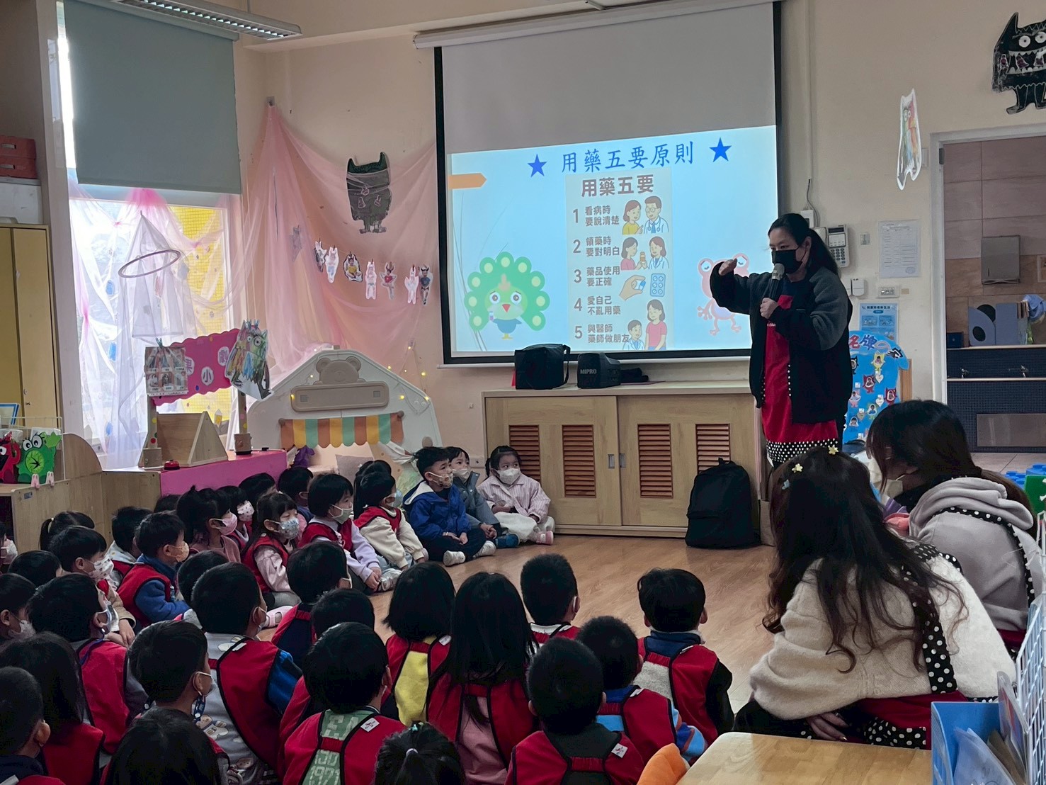 活動中,孩子們學習了守護健康的關鍵密碼:「用藥五要」(看病說清楚、領藥對明白、用法要正確、愛自己不亂用藥、與醫師藥師交朋友)以及**「用藥五不」**(不聽推薦、不信神奇療效、不買不明來源藥品、不吃別人送的藥、不隨意推薦) 。最後,全體師生隨著活潑的「病毒退散歌」快樂律動,在歡笑聲中建立起「做身體主人」的使命感,守護彼此的健康成長 !