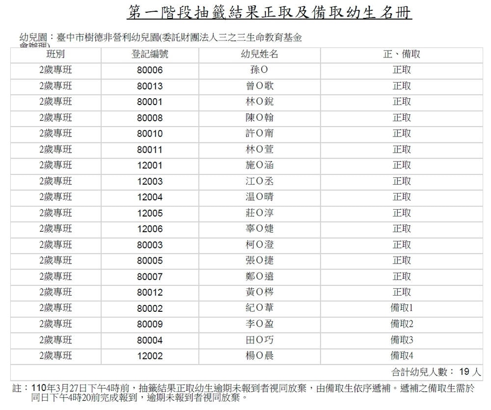 110學年度樹德第一階段抽籤結果正取及備取幼生名冊