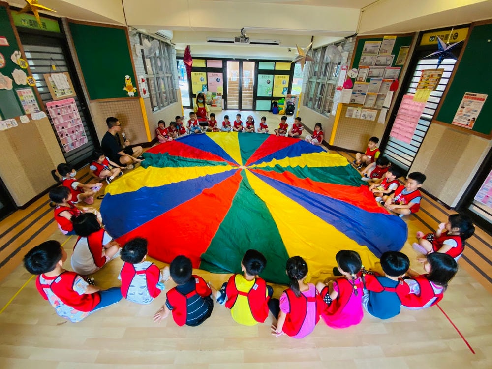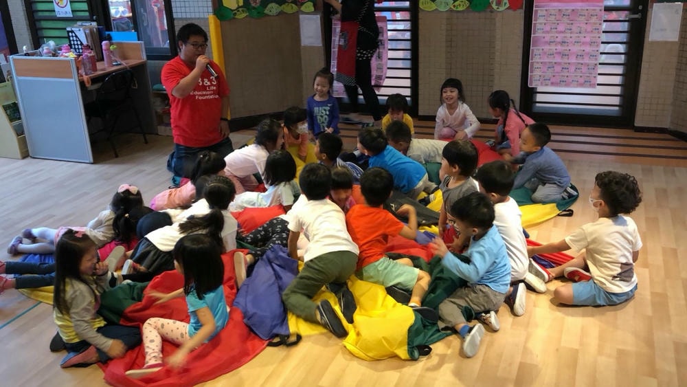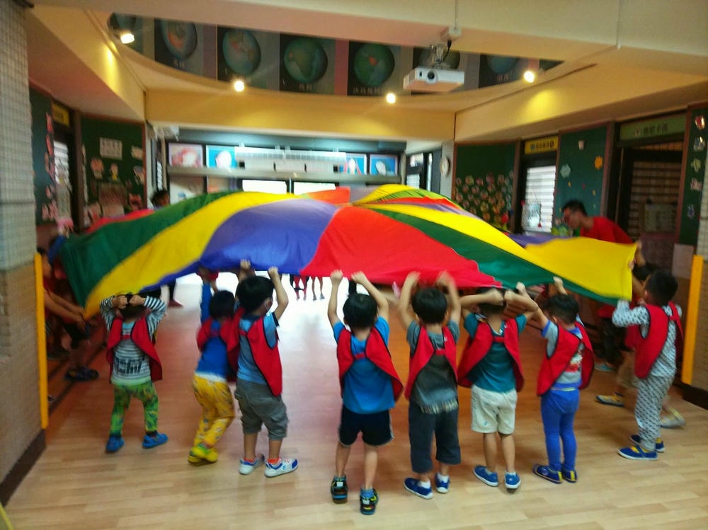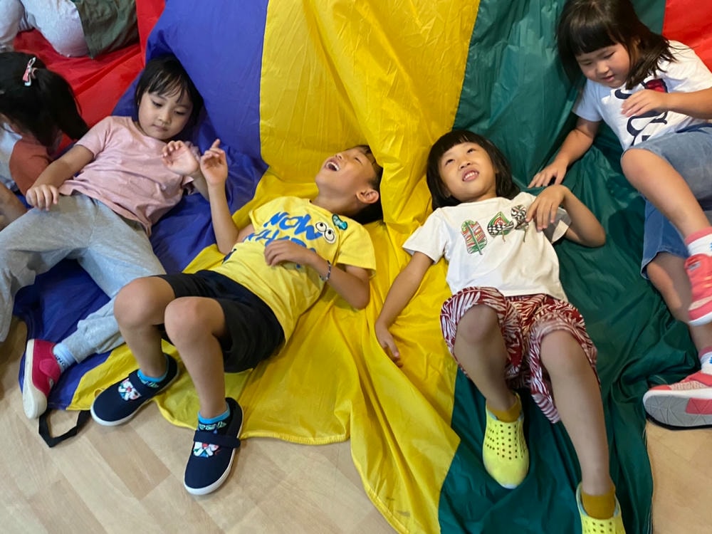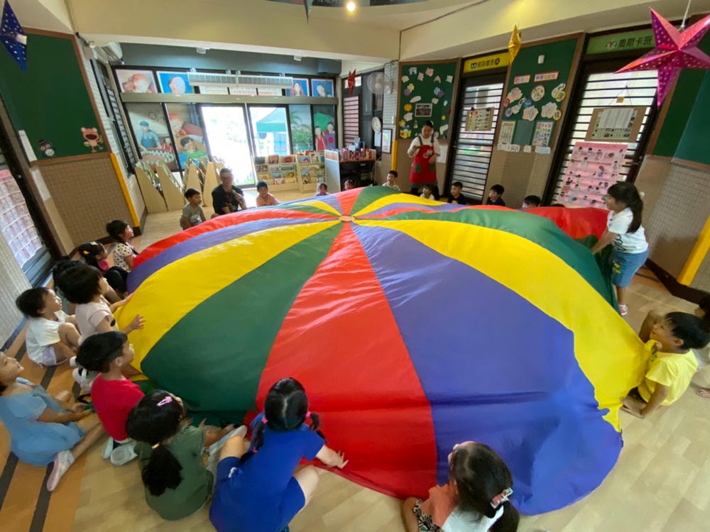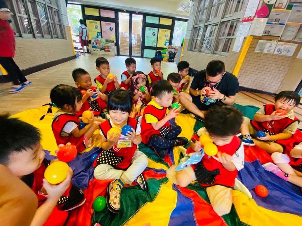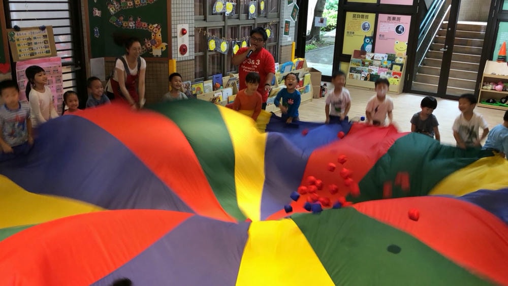 透過氣球傘培養孩子的抓握能力與肌肉發展,彩色小布球就像彩色爆米花一樣,在氣球傘上製作彩色爆米花同時訓練孩子的手部肌肉發展吃掉彩色爆米花時,昌平孩子開心極了!