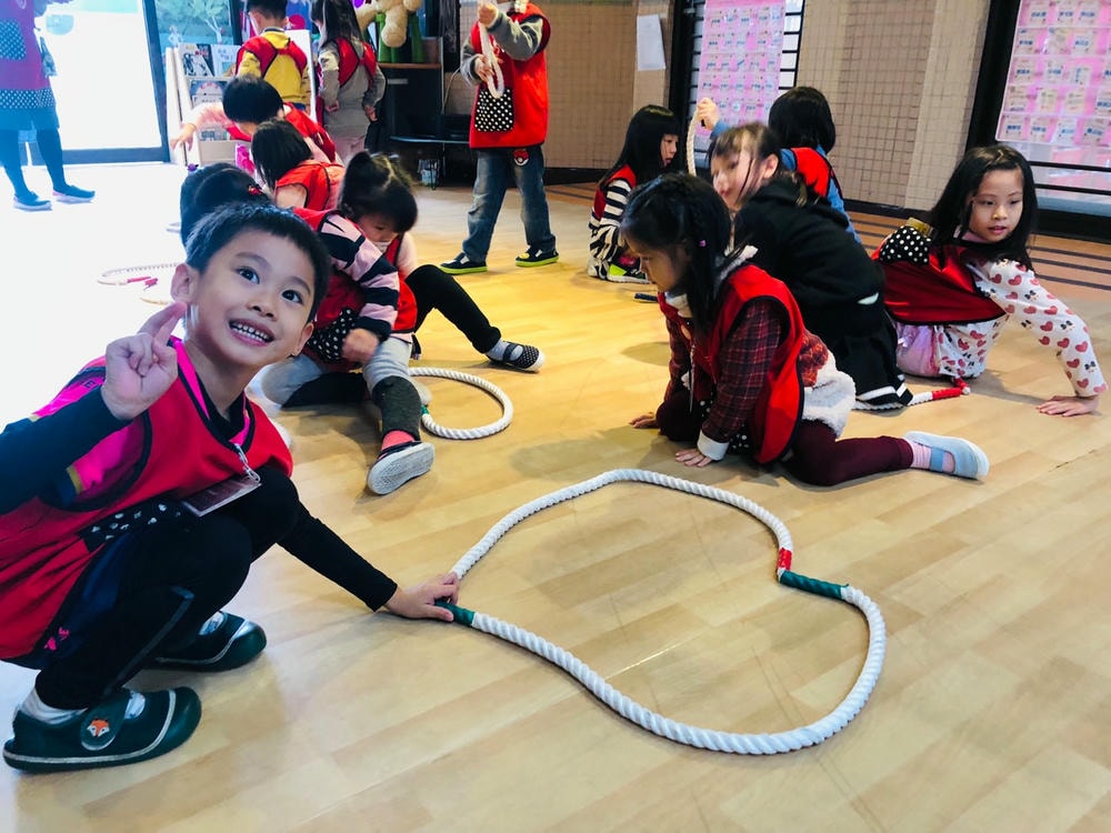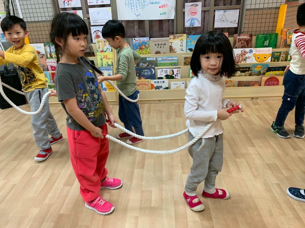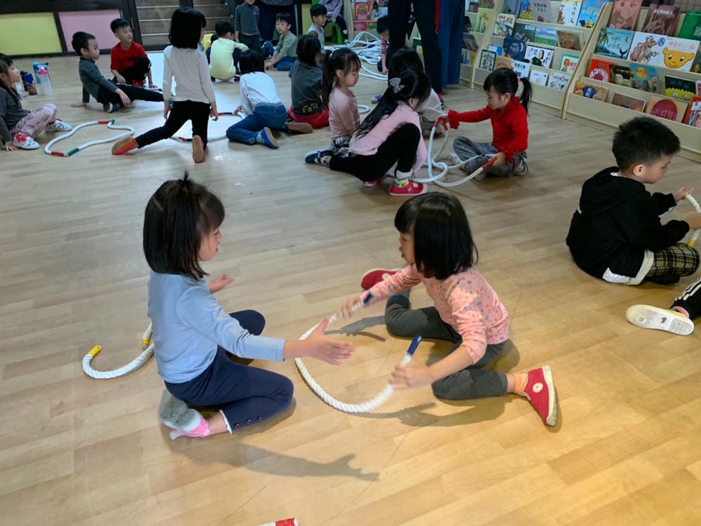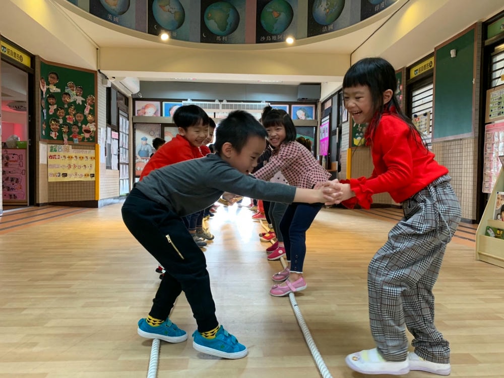 哇~這次大肌肉活動我們用繩子變化好多種不同的玩法喔!我們用繩子折返跑、左右跳、跨跳前進、平衡走路、兩人走鋼索前後座左右相撲跳。這麼多遊戲裡面我們最喜歡玩拔河了!這是一個考驗大家團結合作、講究默契的活動喔!