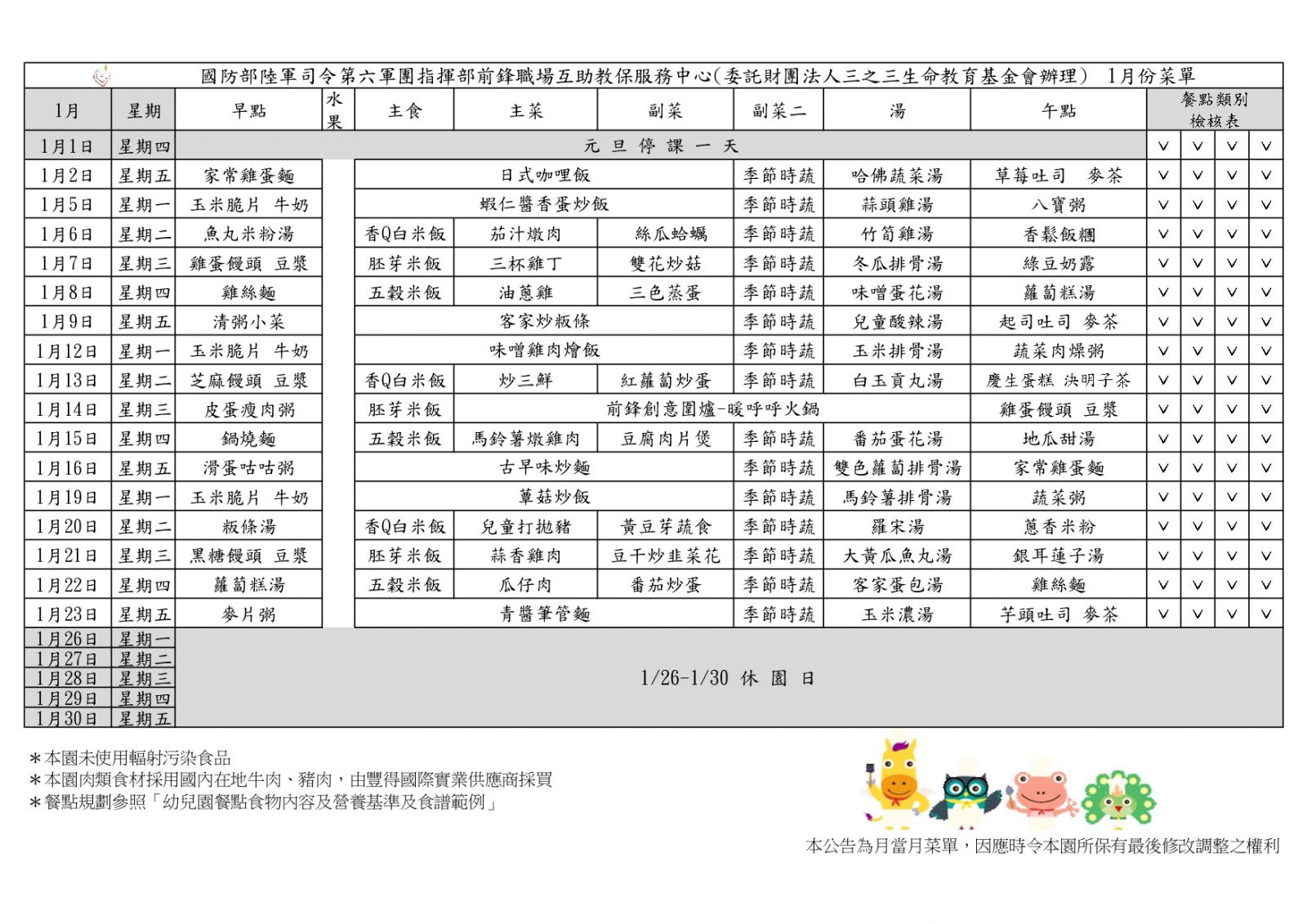 113學年度上學期1月份菜單
