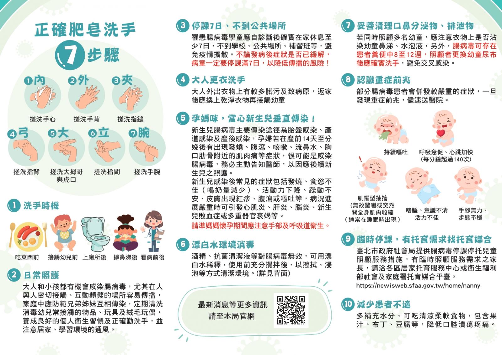 請落實「生病不上學」原則,並養成大人與幼兒皆正確勤洗手的習慣(內、外、夾、弓、大、立、腕),降低病毒傳播風險。
