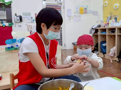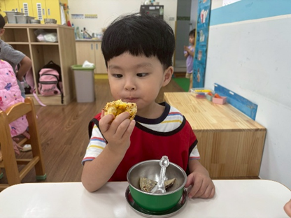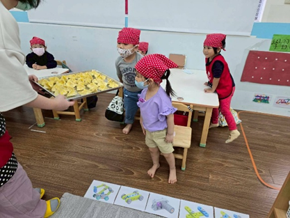 本次活動讓幼兒親手製作酥皮南瓜派。孩子們在老師與志工家長的引導下,觀察南瓜泥的顏色與質地,體驗從攪拌、包餡到壓邊的製作過程。幼兒透過實際操作提升了手部肌肉的靈活度與專注力,也在烘焙過程中感受到食物變化的樂趣。