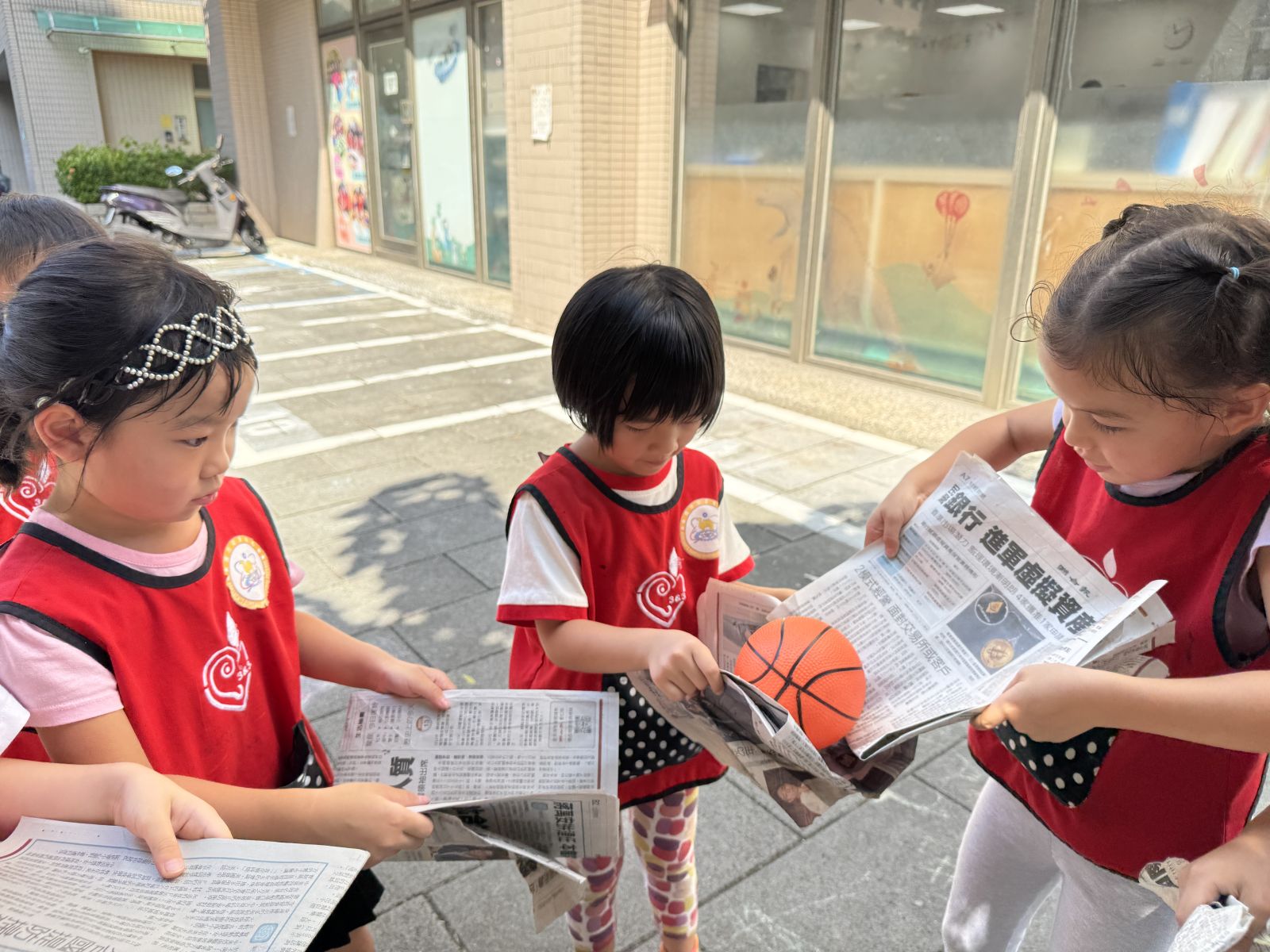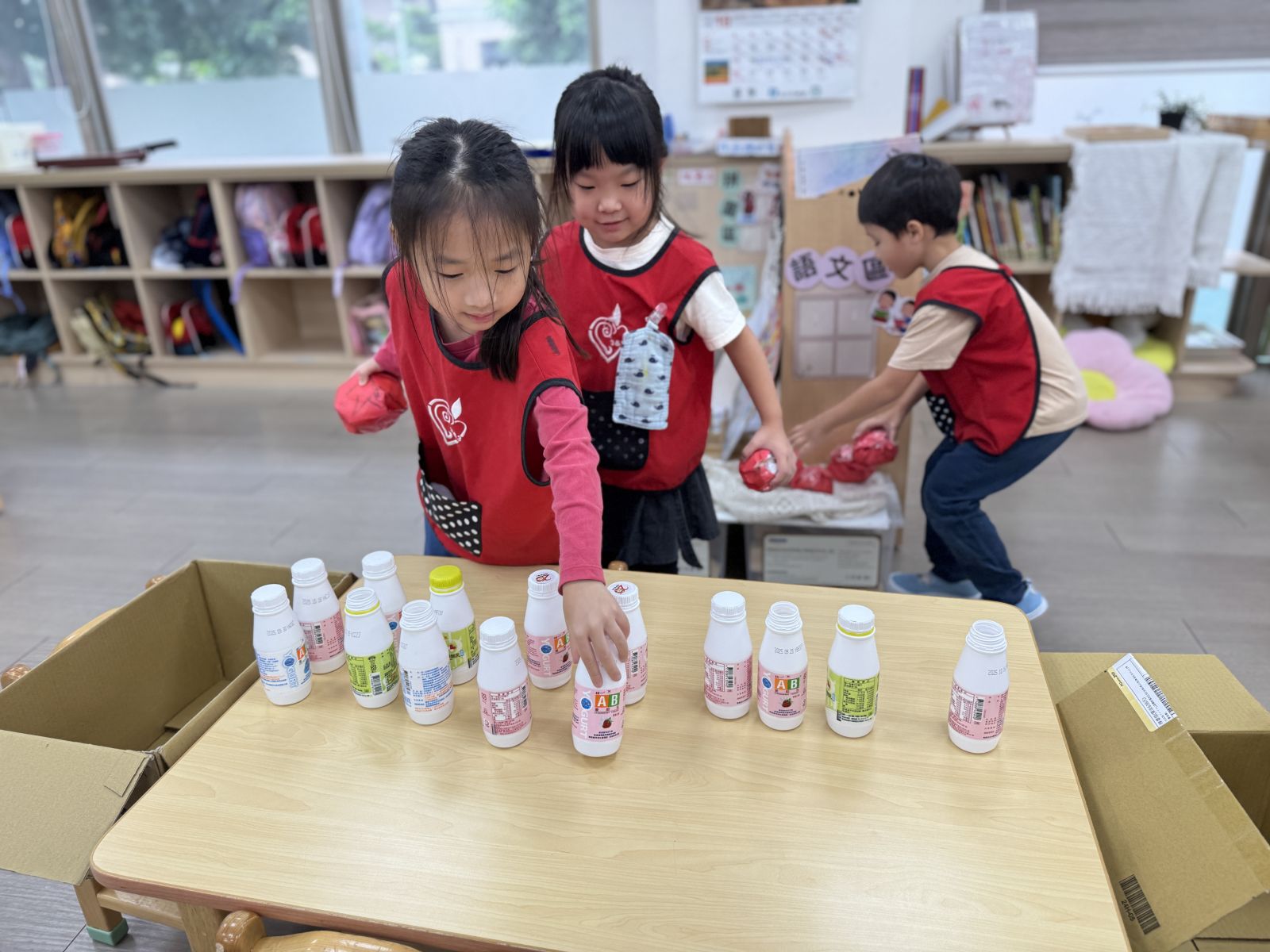 透過先前的課程,孩子們對於資源回收的概念已有基本的認識,也了解到了進行資源回收可以幫助我們的地球變得更好,因此在接下來的課程中,老師持續帶領孩子們透過蒐集生活中的回收物,再利用來進行藝術及體能活動的工具。