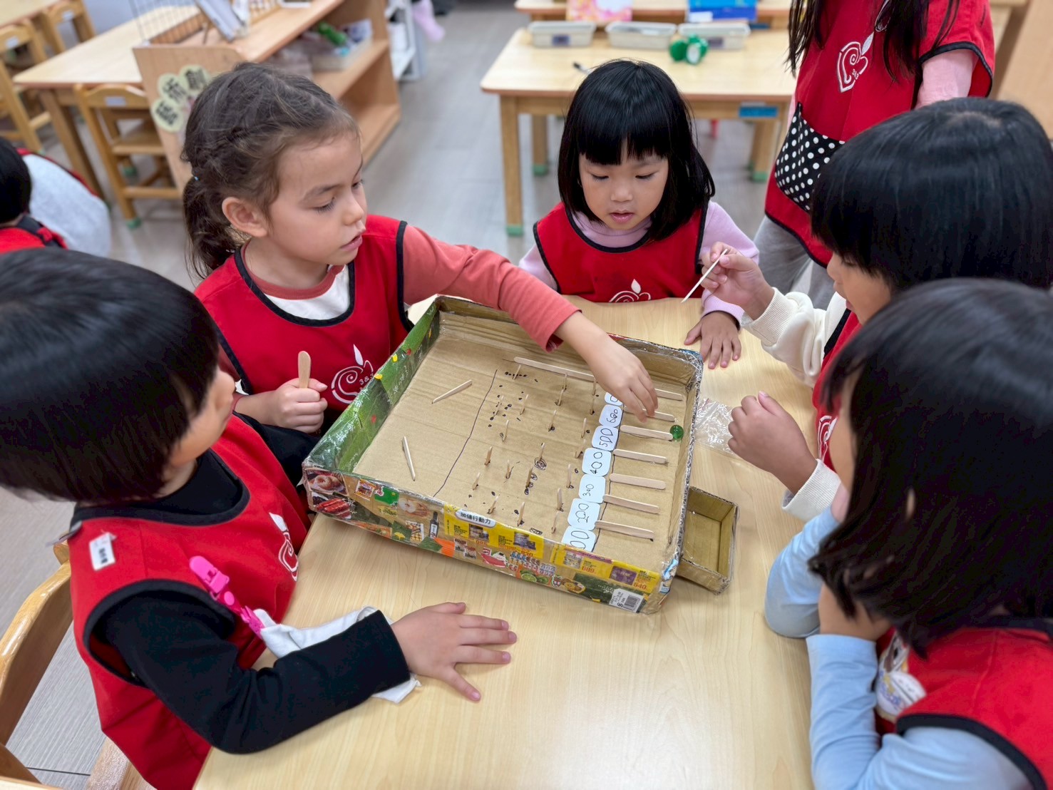 在課程活動中,老師邀請親子運用回收素材製作可玩/可動的回收 玩具,或是回收模型,並邀請幼兒將作品帶至學校與大家分享,並在分享及試玩過後,老師邀請幼兒以小組活動的方式將大家喜歡的回收玩具進行改良,也讓諾貝爾組的幼兒透過彼此與家人製作玩具的經驗一同討論製作出創新的回收玩具。