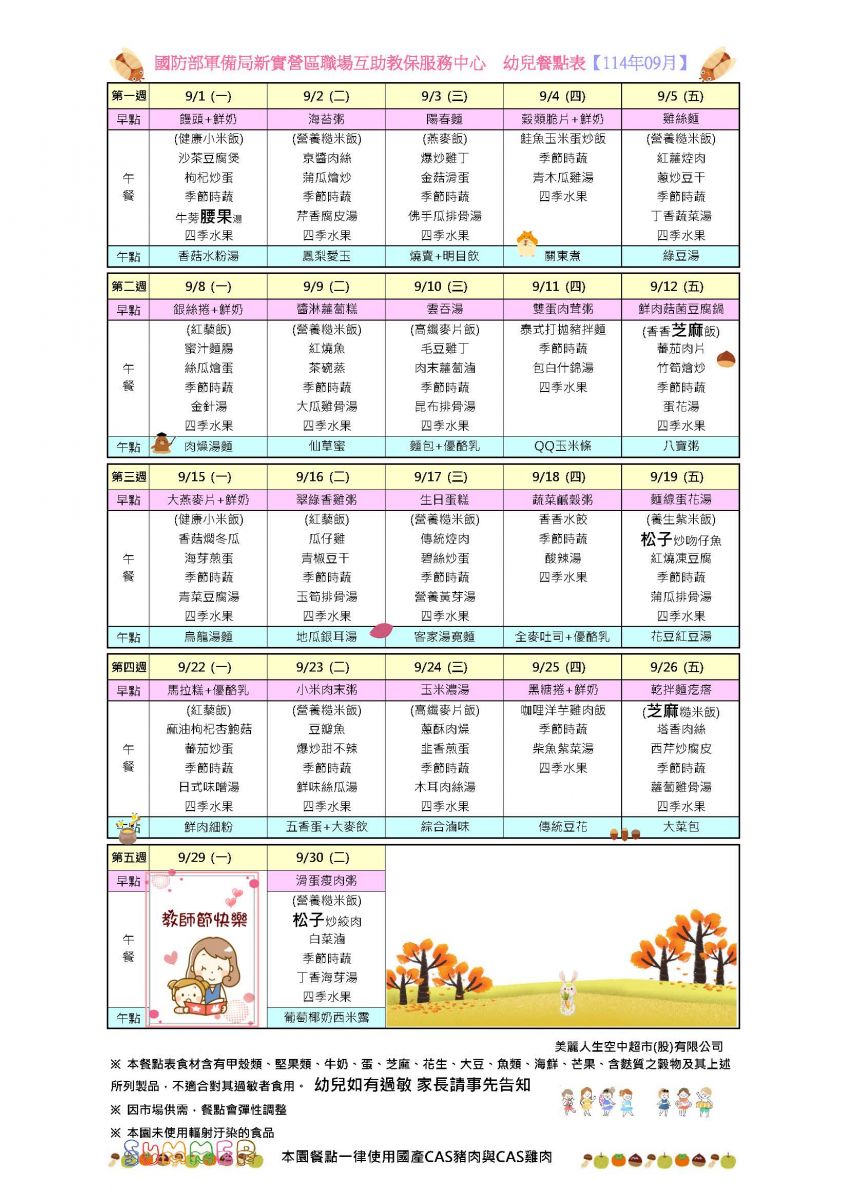 114年09月份餐點表