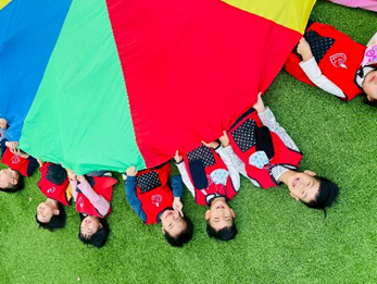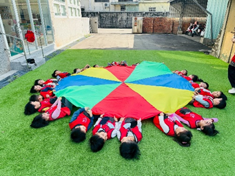 蓋棉被:幼兒站著圍繞在氣球傘外圍,聽到音樂開始繞著球球傘走,音樂停止時,幼兒需找到一塊顏色躲進去蓋棉被。