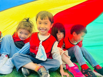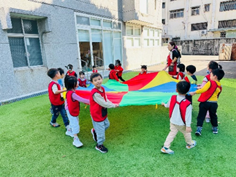 過程不僅讓幼兒學習專注聆聽指令並迅速作出反應,也在舉高與下拉的動作中訓練了手臂的力量與協調能力。進入傘中的幼兒能在短暫的包覆感中,透過身體的感受刺激前庭覺與觸覺統合,站在外圍配合動作的幼兒則在團體合作中發展出節奏感