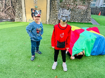 4. 大野狼來了!快跑!:幼兒扮演大野狼和小豬,其他幼兒抓著傘並聽口令或音樂變化,在提示出現時迅速反應與移動,傘打開時,小豬要趕快躲到裡面,避免被抓到。