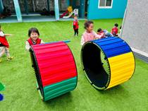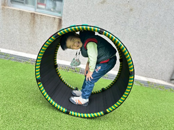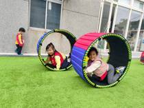4.一起泡溫泉:3~4人一組,幼兒們輪流奔跑跳進滾輪裡,感受滾動的樂趣;再從滾輪中爬出後,快速奔向下一站,與同伴擊掌互換,增添合作與互動的趣味。