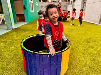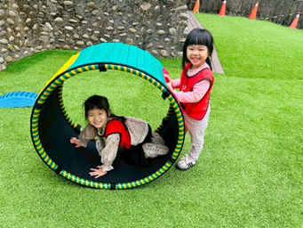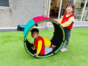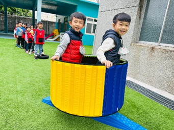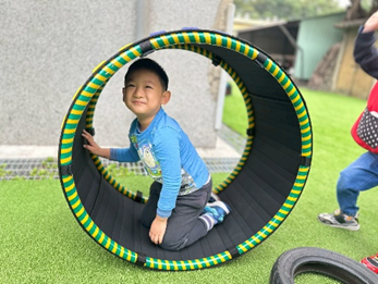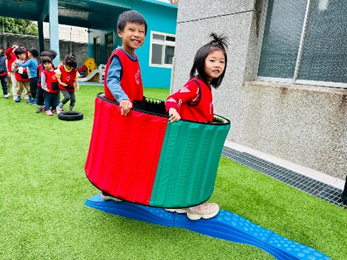 2.滾輪大冒險:幼兒利用滾輪互相合作,一個在裡面,一個負責推,抵達終點後在互換,共同合作完成一連串的挑戰任務。