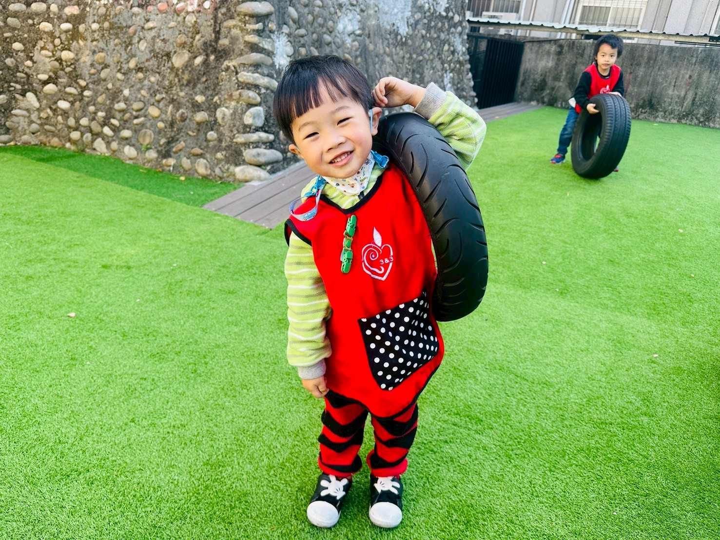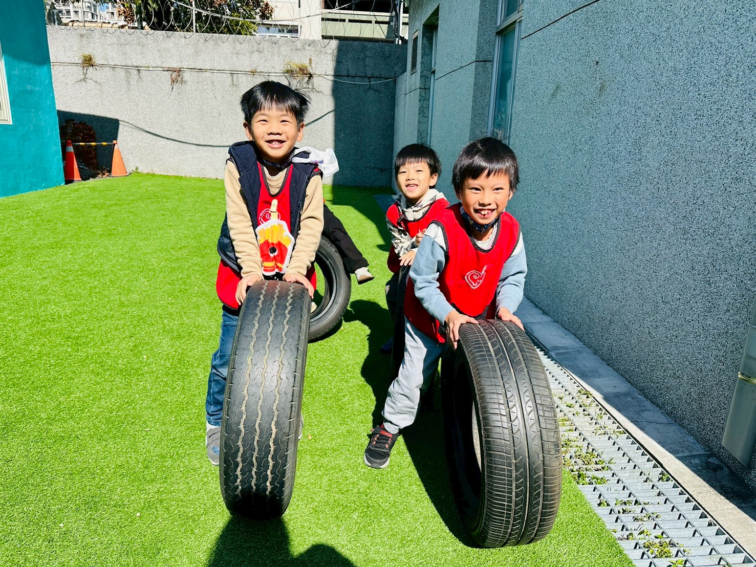 幼兒雙手扶著輪胎,將輪胎從起點滾動至終點後再返回。過程中需控制力道與方向,培養手臂力量、核心穩定度及身體協調能力。