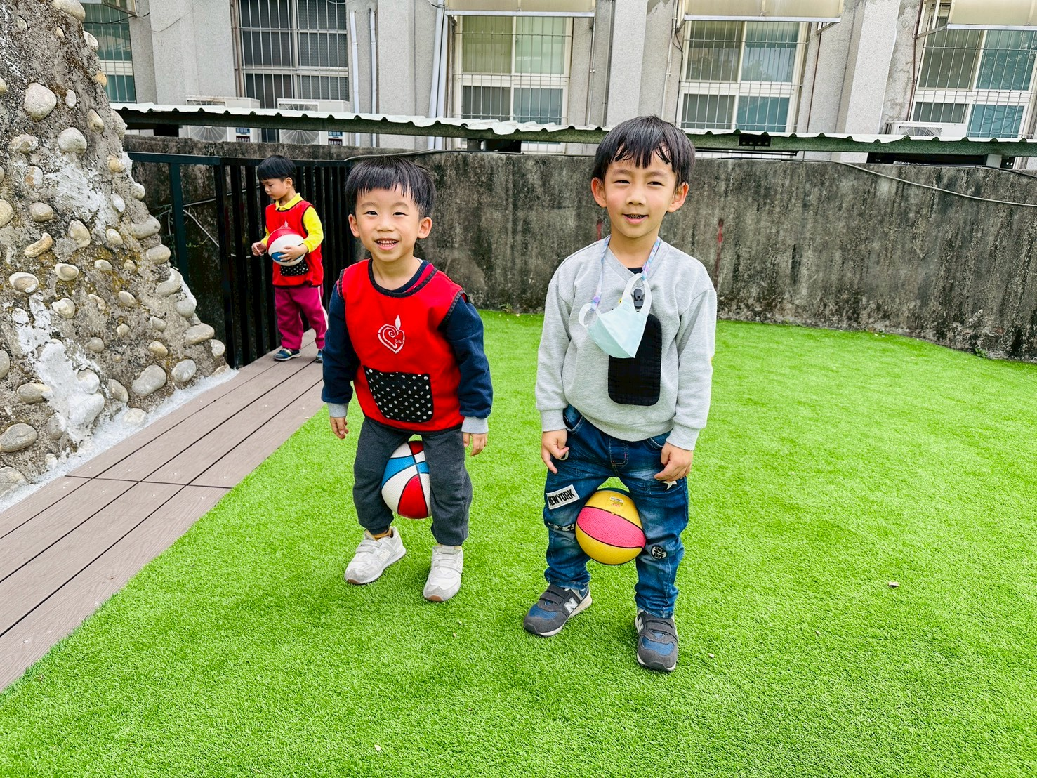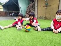 ★S行大冒險:幼兒分成兩組,分別為大中組與小中組,各組依序排好隊伍。活動開始後,由每組第一位幼兒雙手推著大龍球,沿著地面排放的三角錐以 S 行路線向前滾動,到達終點後抱著大龍球回到隊伍。完成後,將大龍球交給下一位幼兒,並回到隊伍後方排隊,依序進行。