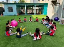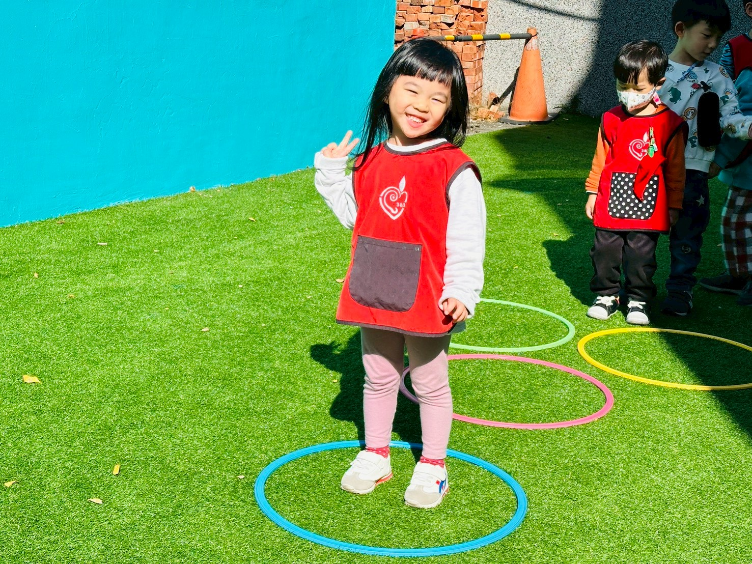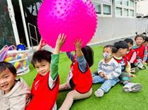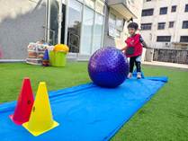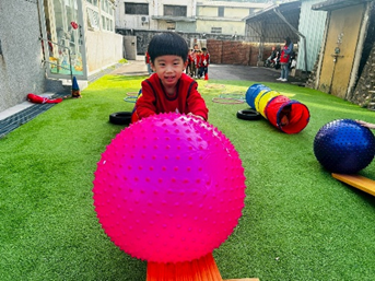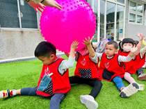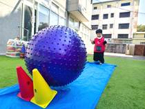運用球及不同的道具把遊戲變有趣,幼兒走過平衡木,學習肢體控制及平衡感,抱著球過跳躍呼拉圈,增加幼兒移動性穩定度,最後運用三角錐推球行走也能增加身體協調性及手眼協調能力哦!
