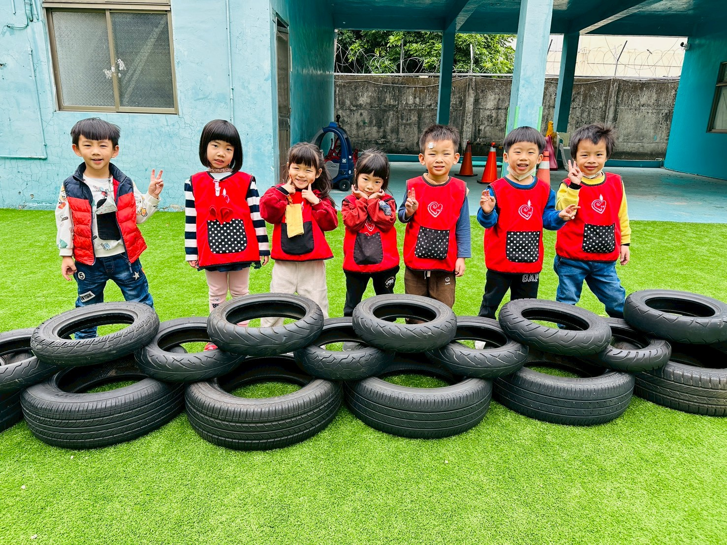 輪胎遊戲:小班幼兒一腳一步練習跨越輪胎,中大幼兒練習雙腳連續跳躍的動作。