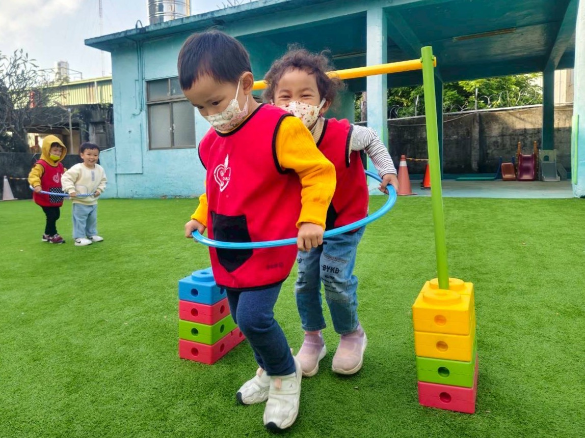 汽車哺哺:幼兒兩人一組共同參與活動,雙手握住呼拉圈,協力向前移動,繞過設置的三角錐後直至終點完成挑戰。
