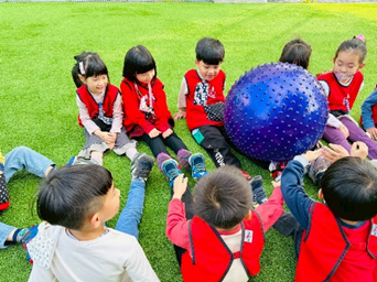 ★龍球同心行:幼兒分為兩組,分別為大中組與小中組,各組依序排成一列。活動開始後,每兩位幼兒前後各持一根棒子,共同托著大龍球,沿路繞過三角錐後返回隊伍,並與下一組幼兒交接,依序進行。