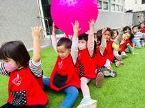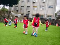★滾滾大龍球:幼兒分成兩組,分別為大中組與小中組,各組依序排好隊伍。活動開始後,由每組第一位幼兒雙手推著大龍球,沿著地面排放的三角錐直線向前滾動並繞行一圈。完成後將大龍球交給下一位幼兒,再回到隊伍後方排隊,依序進行。