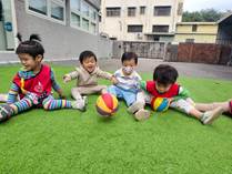 ★龍球接接樂:請幼兒平坐於地面上,雙手抱著大龍球,依序將球傳遞給下一位幼兒。