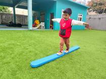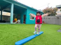 平衡過橋:踩上平衡板前進,保持身體穩定不跌倒,培養平衡感與核心肌群控制。