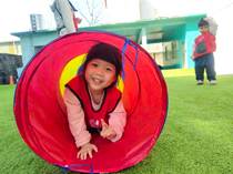 ★龍球保齡大挑戰:幼兒先爬行通過隧道,出來後將大龍球沿水谷市遊具路線向前推行,最後像保齡球一樣擊倒前方的三角錐。