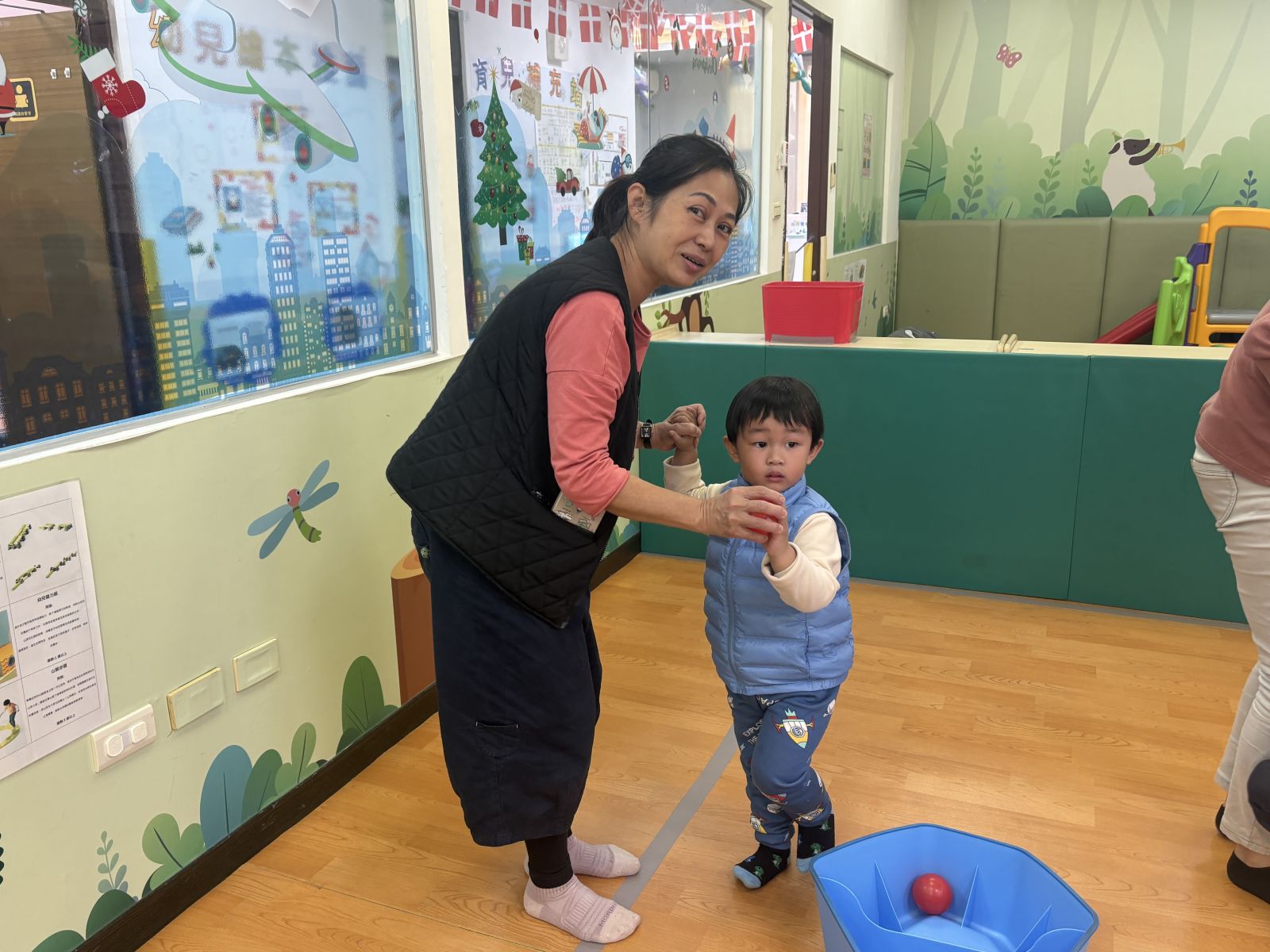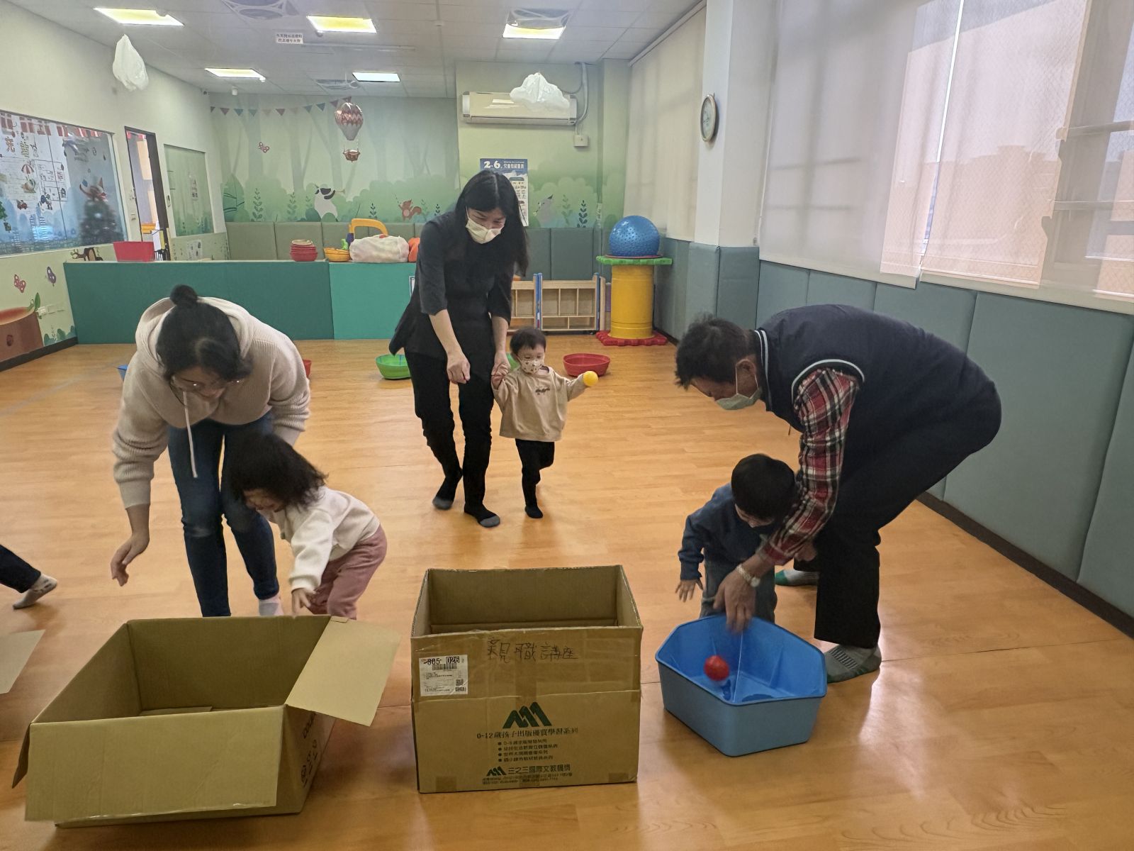 家長透過不織布一同合作將幼兒捲起來變成春捲,並且一起玩許多有趣的遊戲