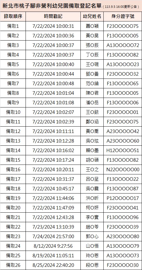 新北市桃子腳非營利幼兒園113學年度備取登記(已公告備取名單)