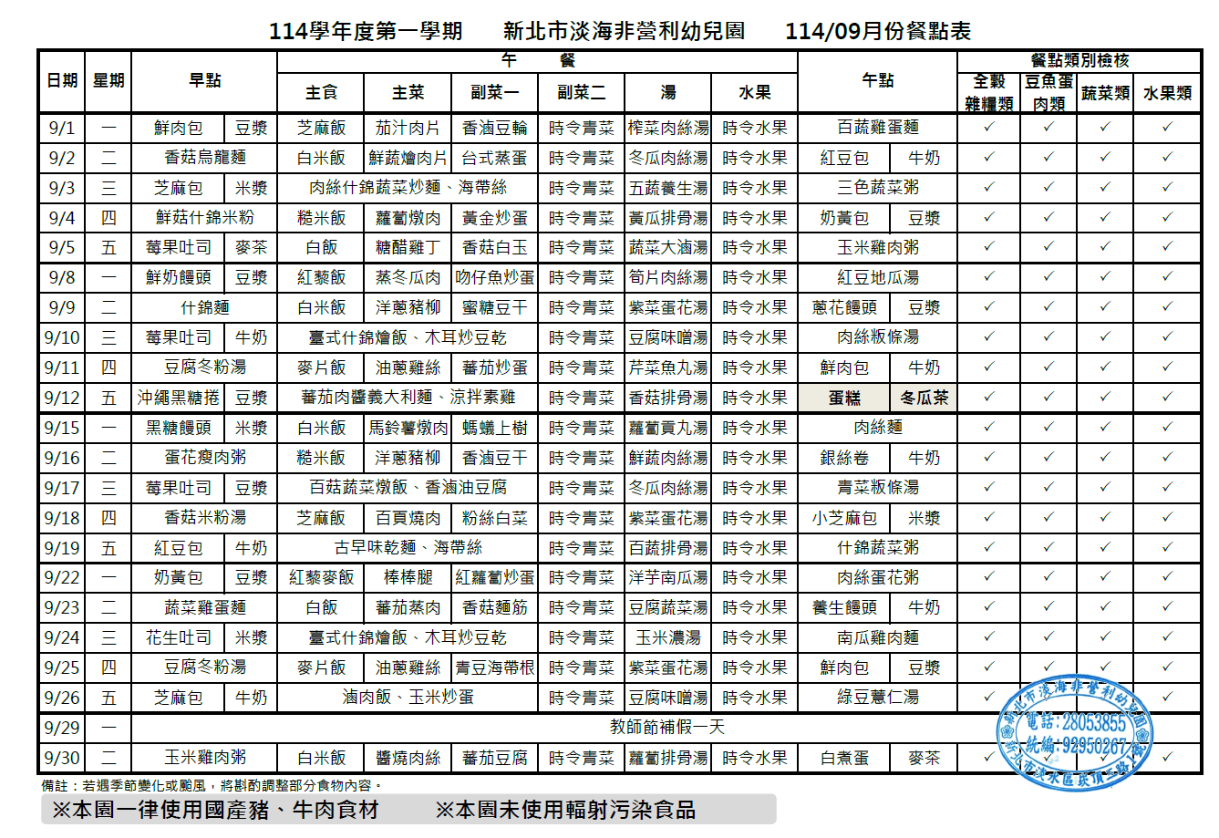 113/09月菜單