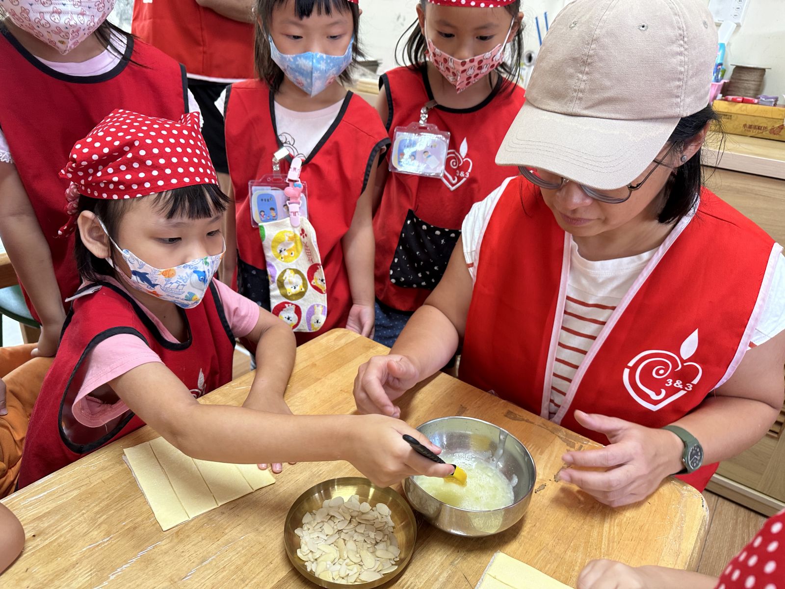 家長帶著孩子一起製作杏仁千層酥,孩子們在輕鬆愉快的氛圍中學習揉麵團、塗抹杏仁餡,並層層堆疊酥皮。這不僅增進親子間的互動,還讓孩子們體驗烘焙的樂趣,並感受完成美味點心的成就感。
