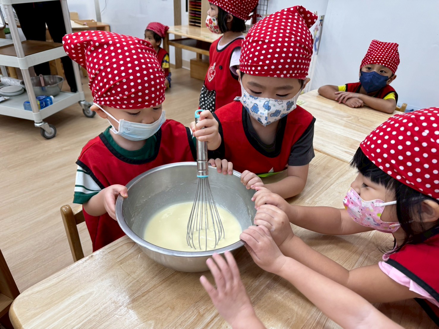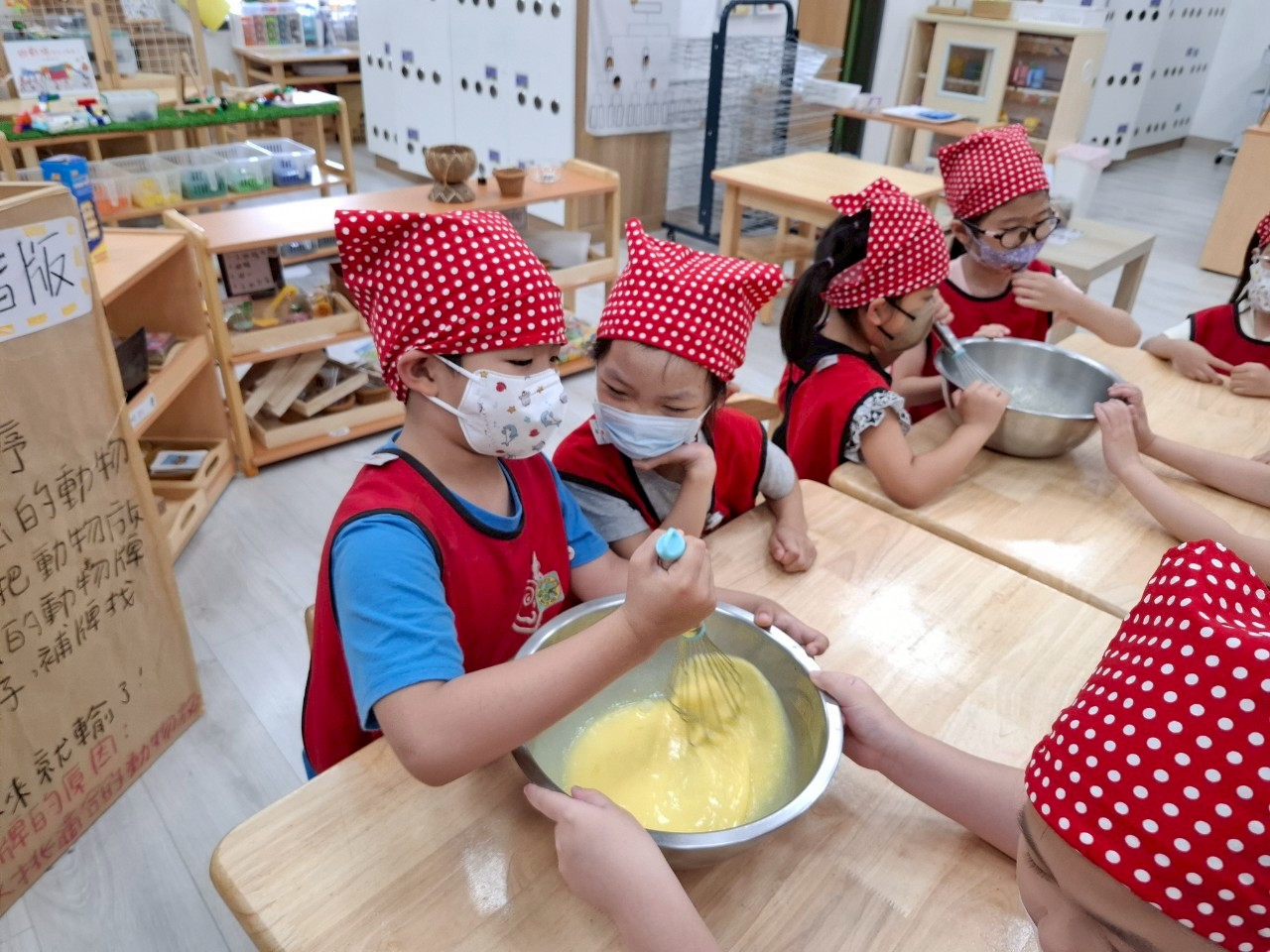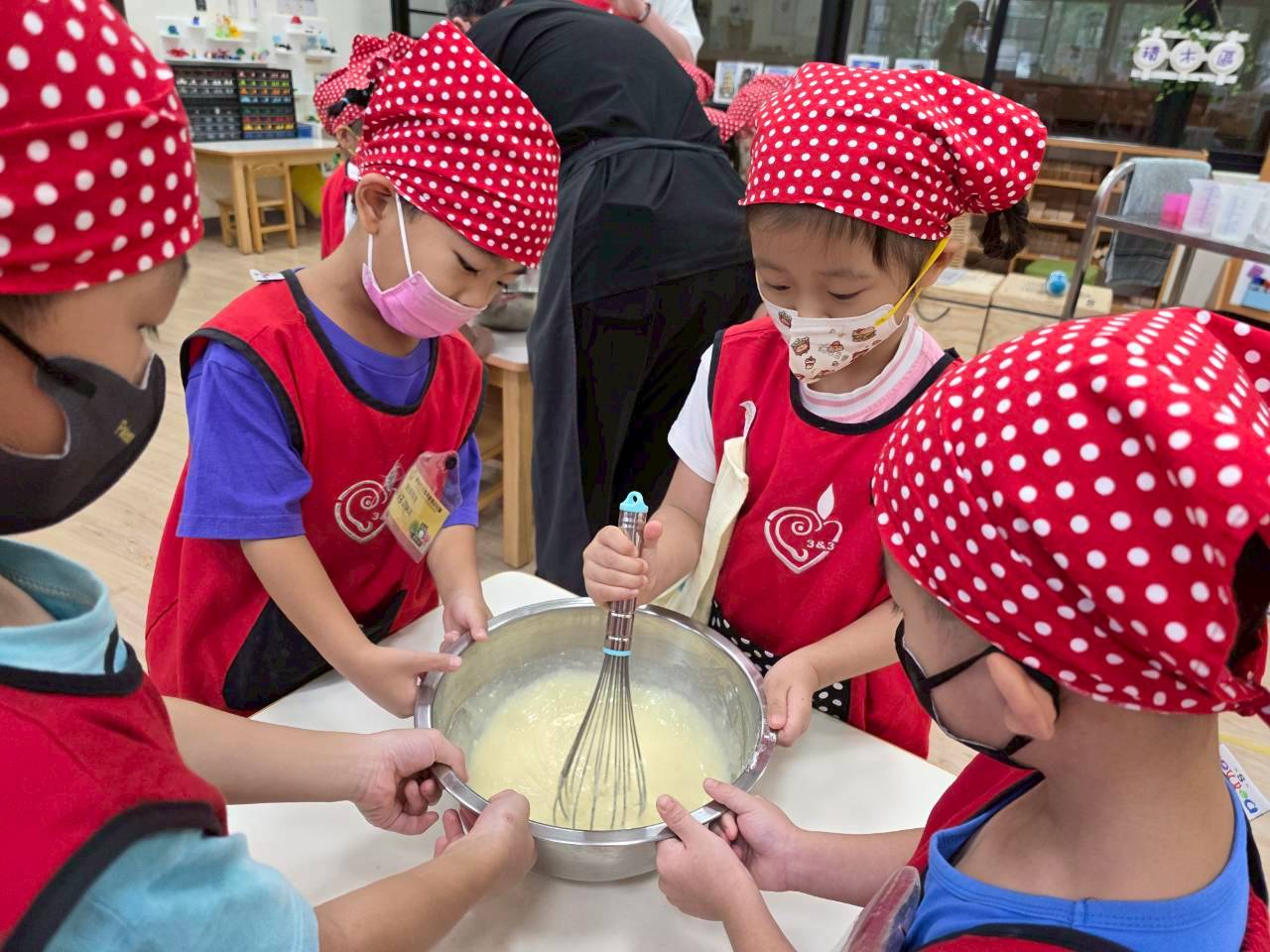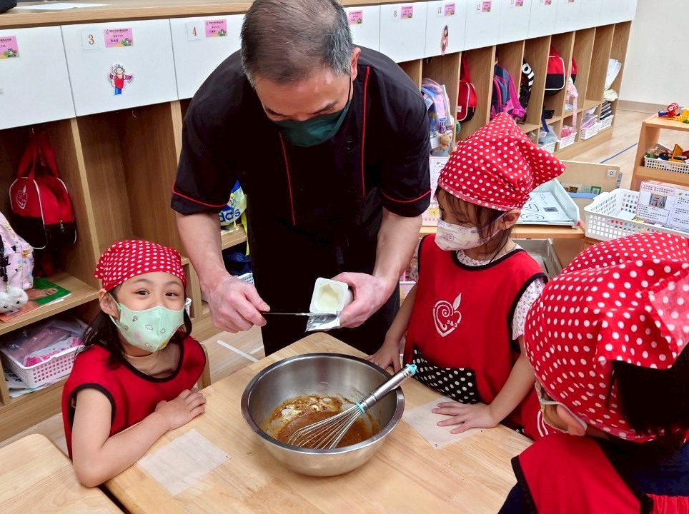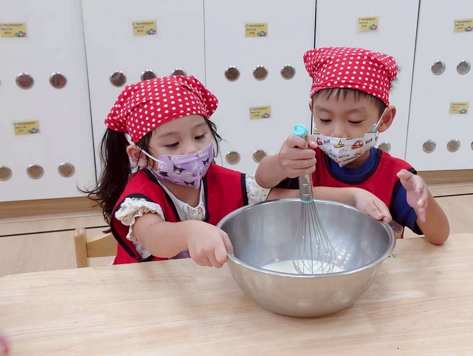 這個月我們一起動手做雞蛋糕,學習食材名稱與步驟,透過攪拌麵糊、倒入模型,體驗烘焙樂趣。