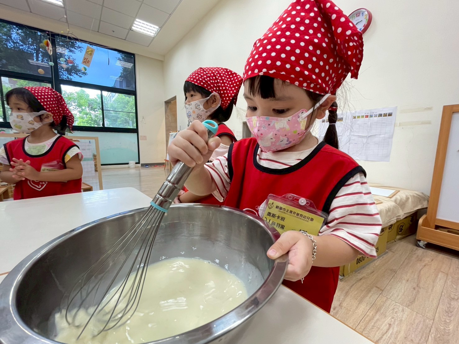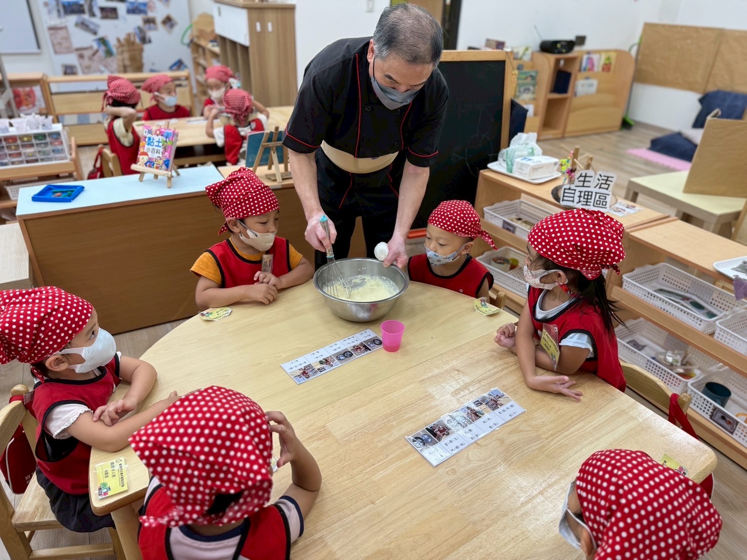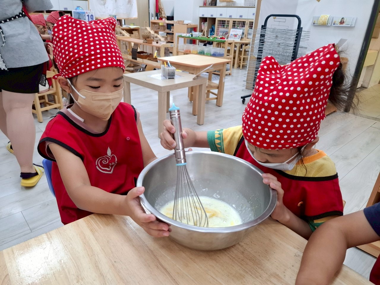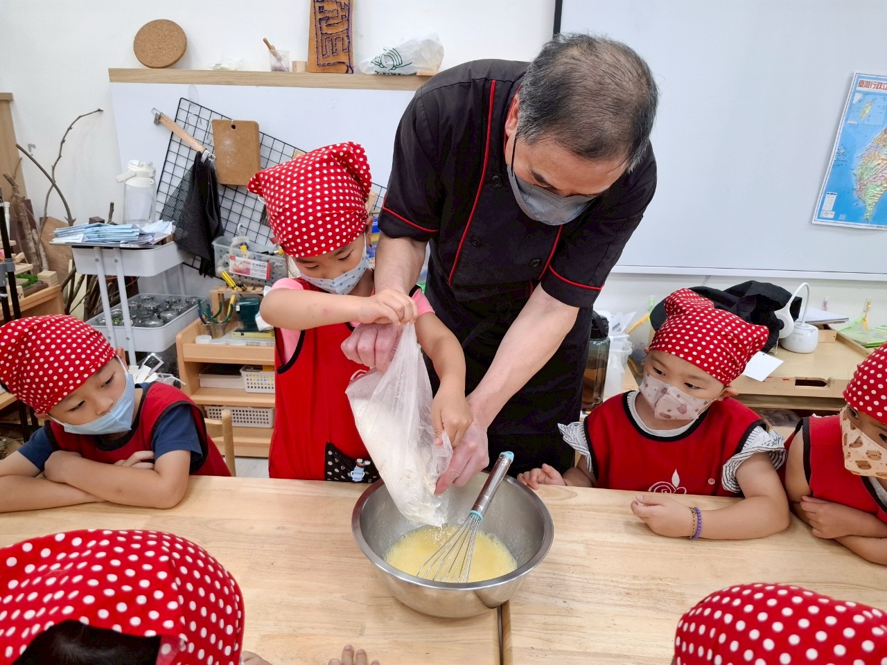 這個月我們一起動手做雞蛋糕,學習食材名稱與步驟,透過攪拌麵糊、倒入模型,體驗烘焙樂趣。