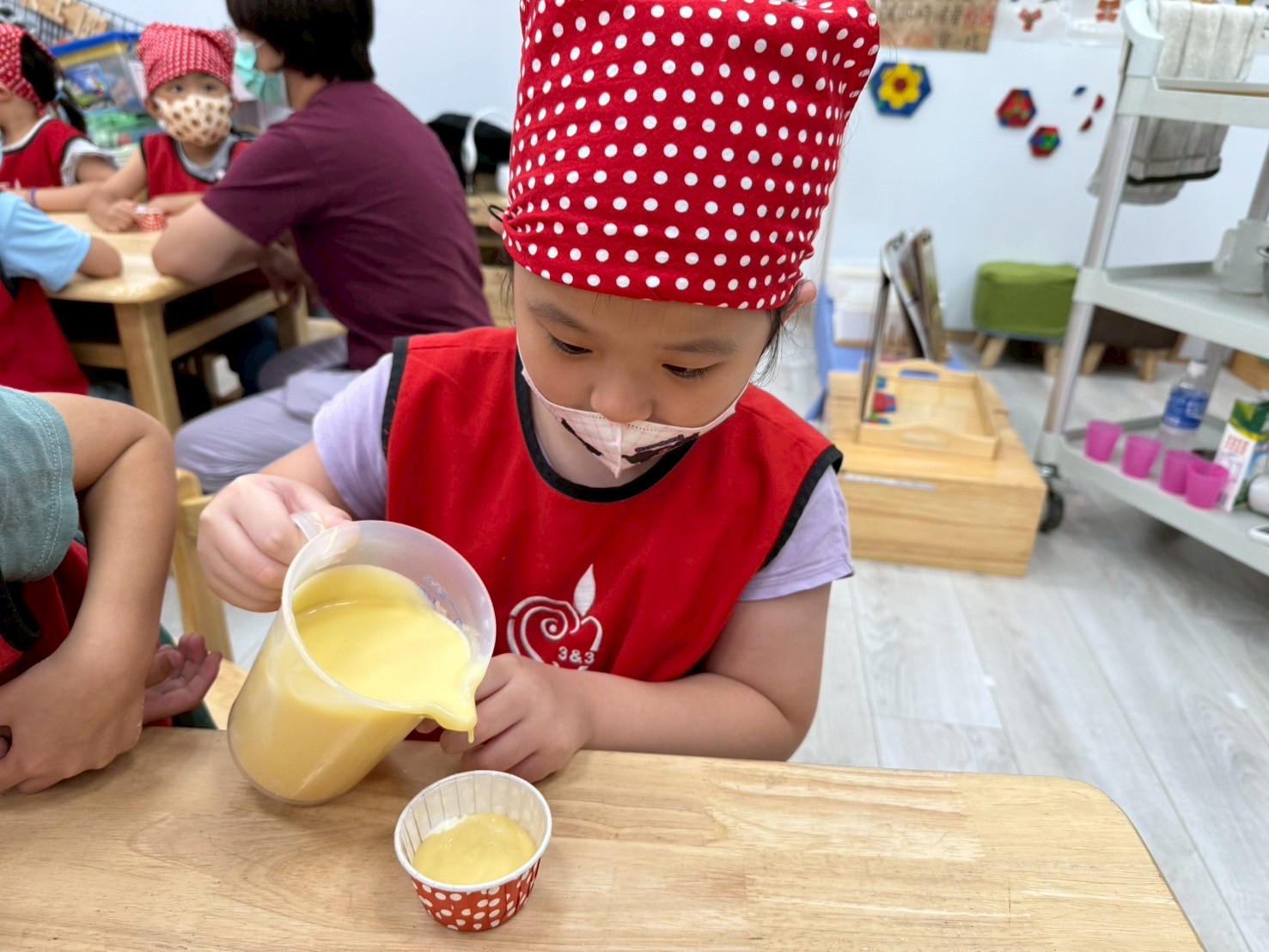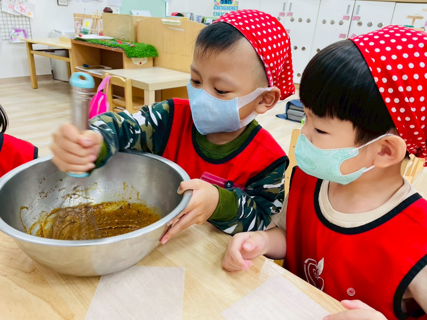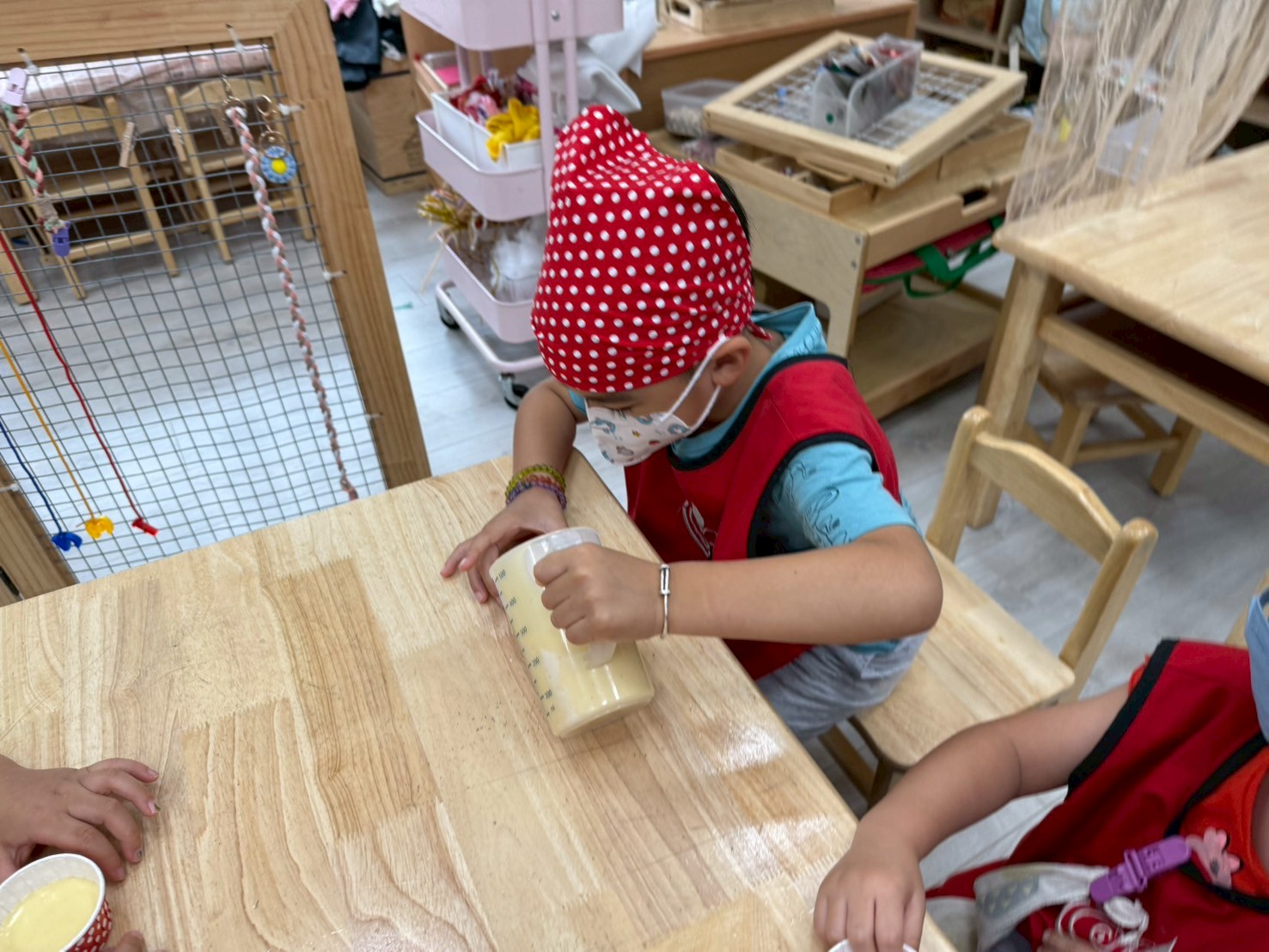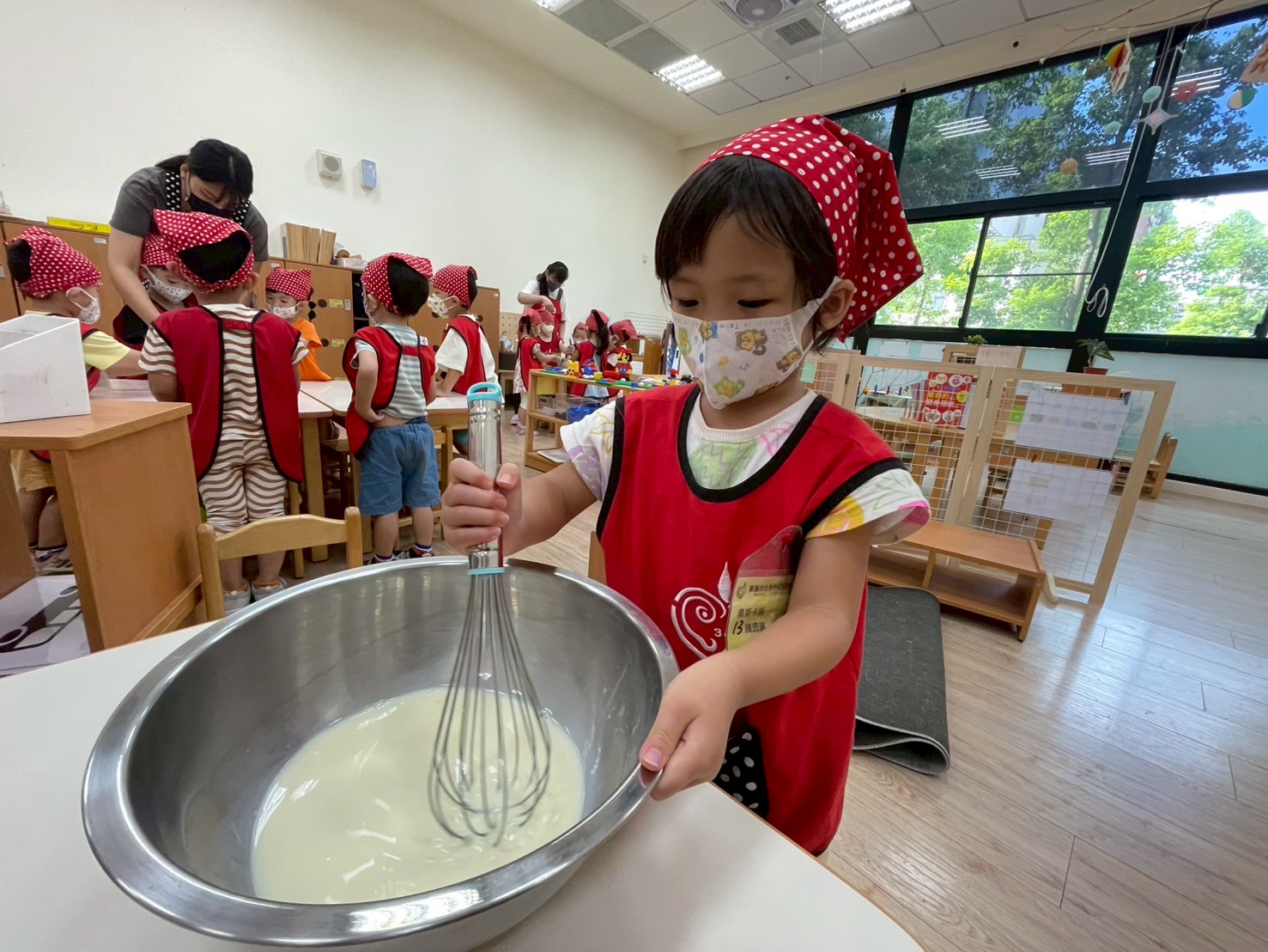這個月我們一起動手做雞蛋糕,學習食材名稱與步驟,透過攪拌麵糊、倒入模型,體驗烘焙樂趣。