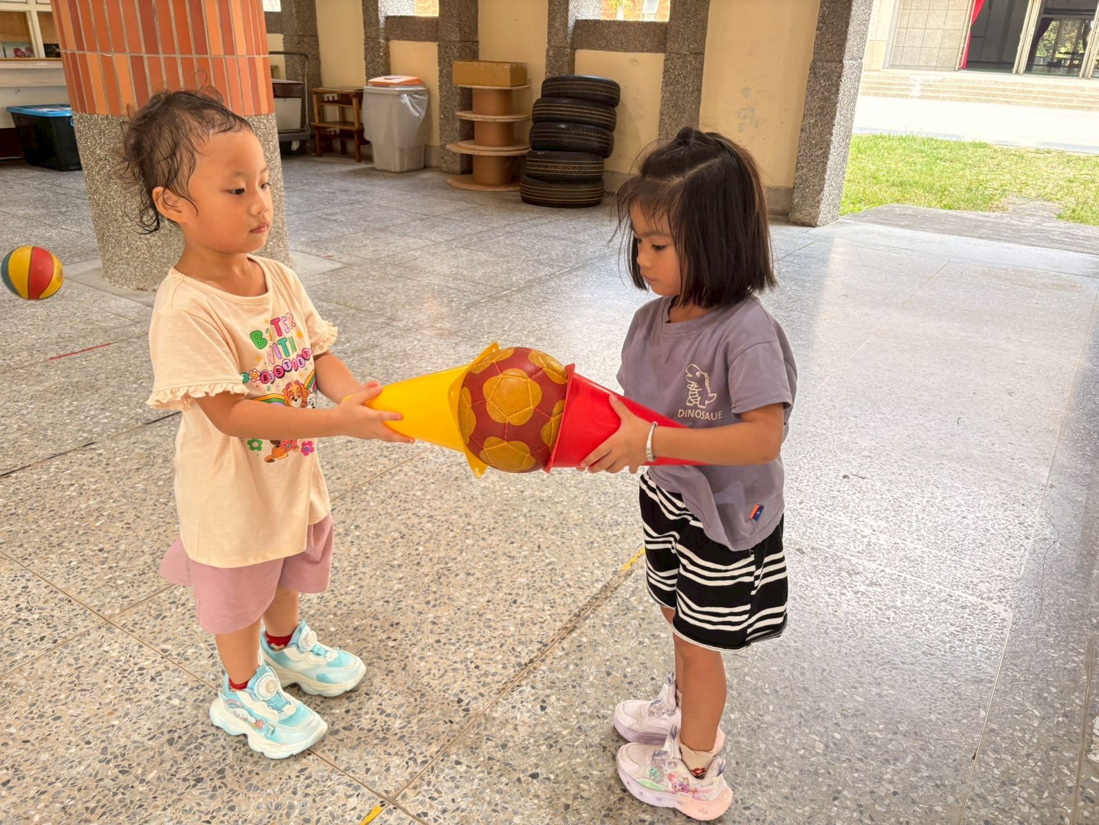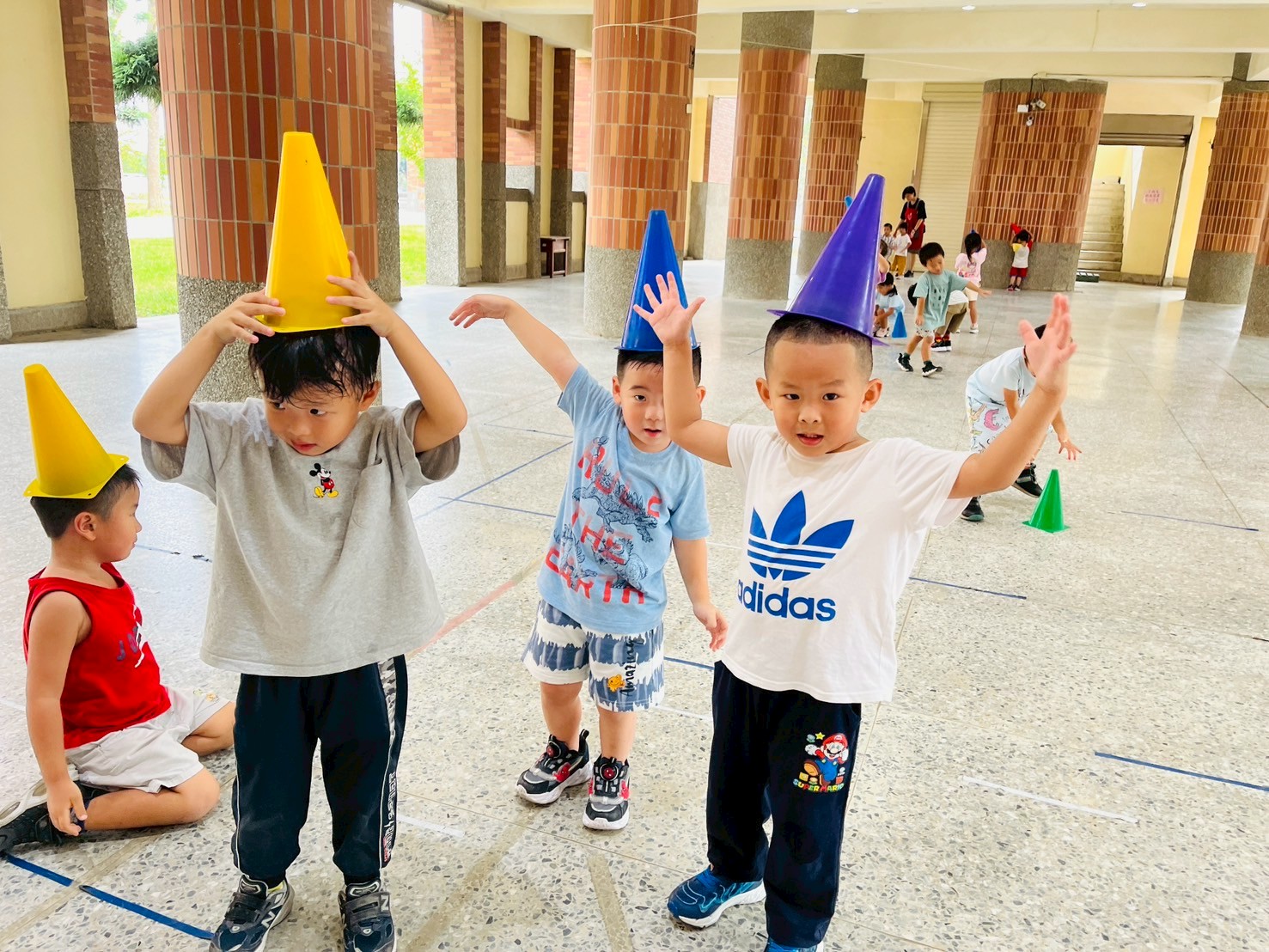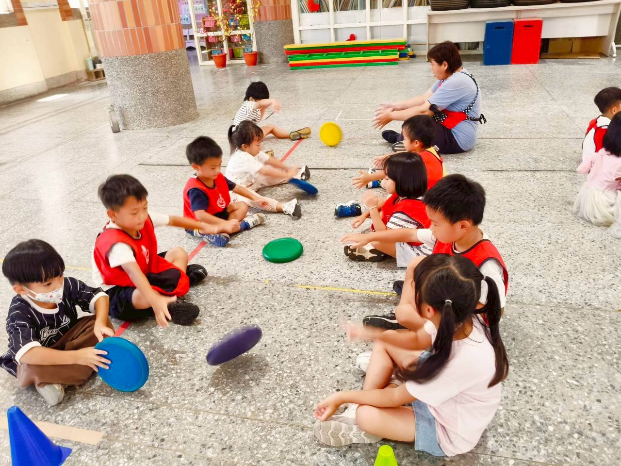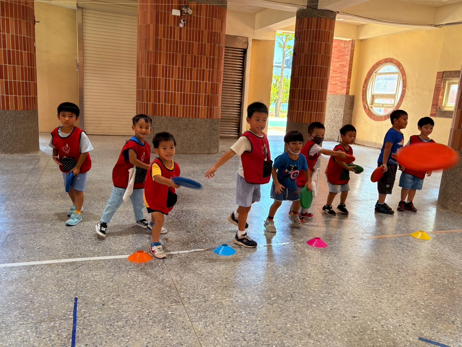 1.依序將5個呼拉圈套進角錐中,練習上臂力量與控制能力,完成後整理好將呼拉圈交給下一位同學輪流進行遊戲