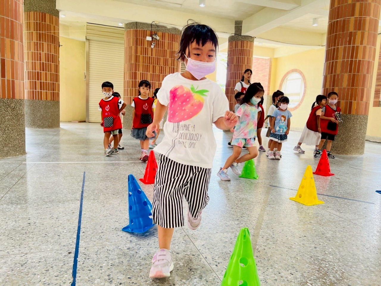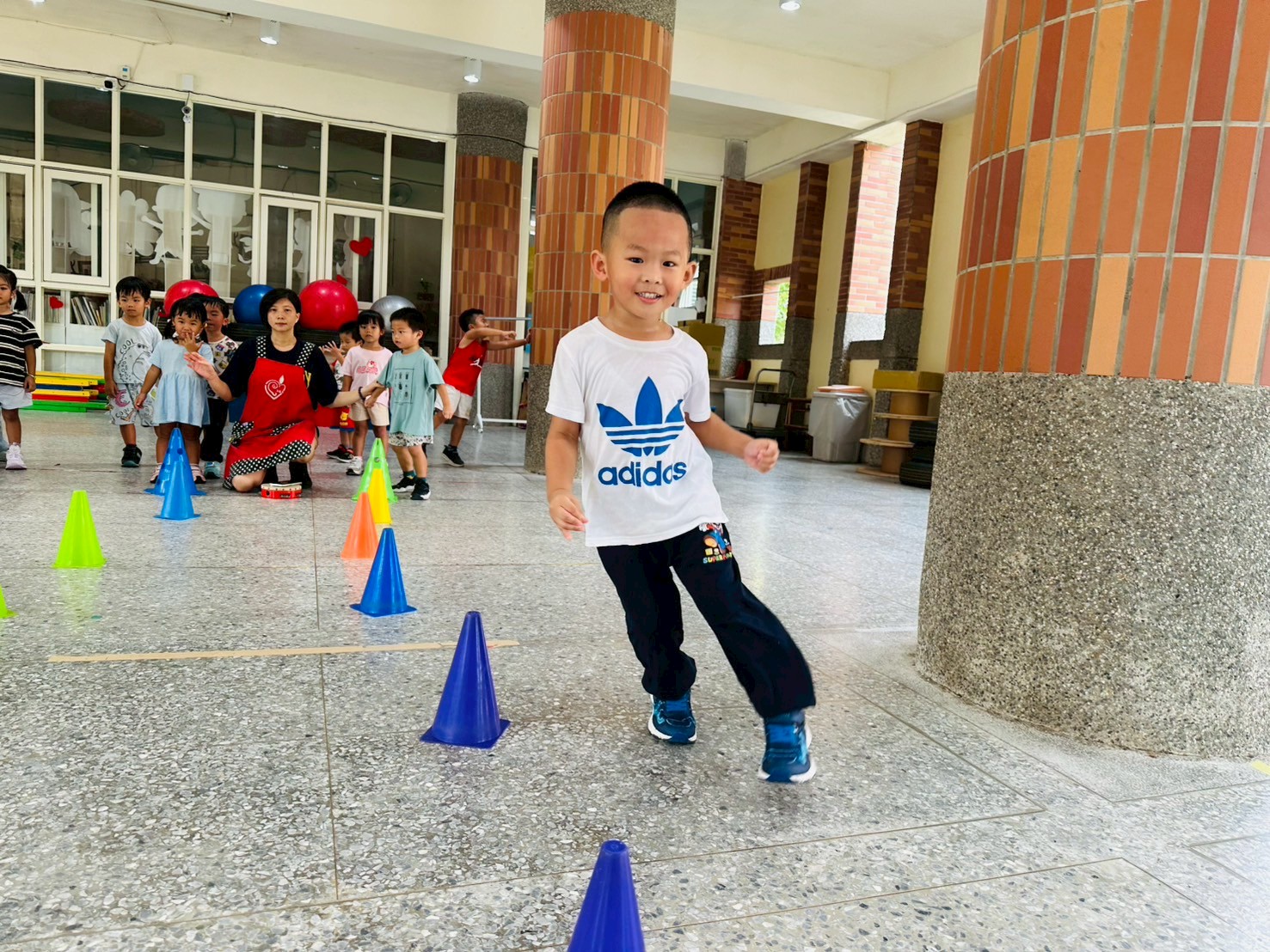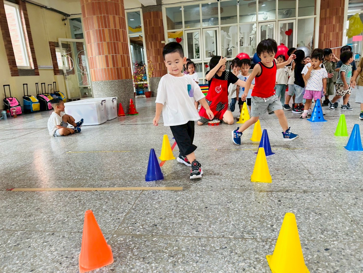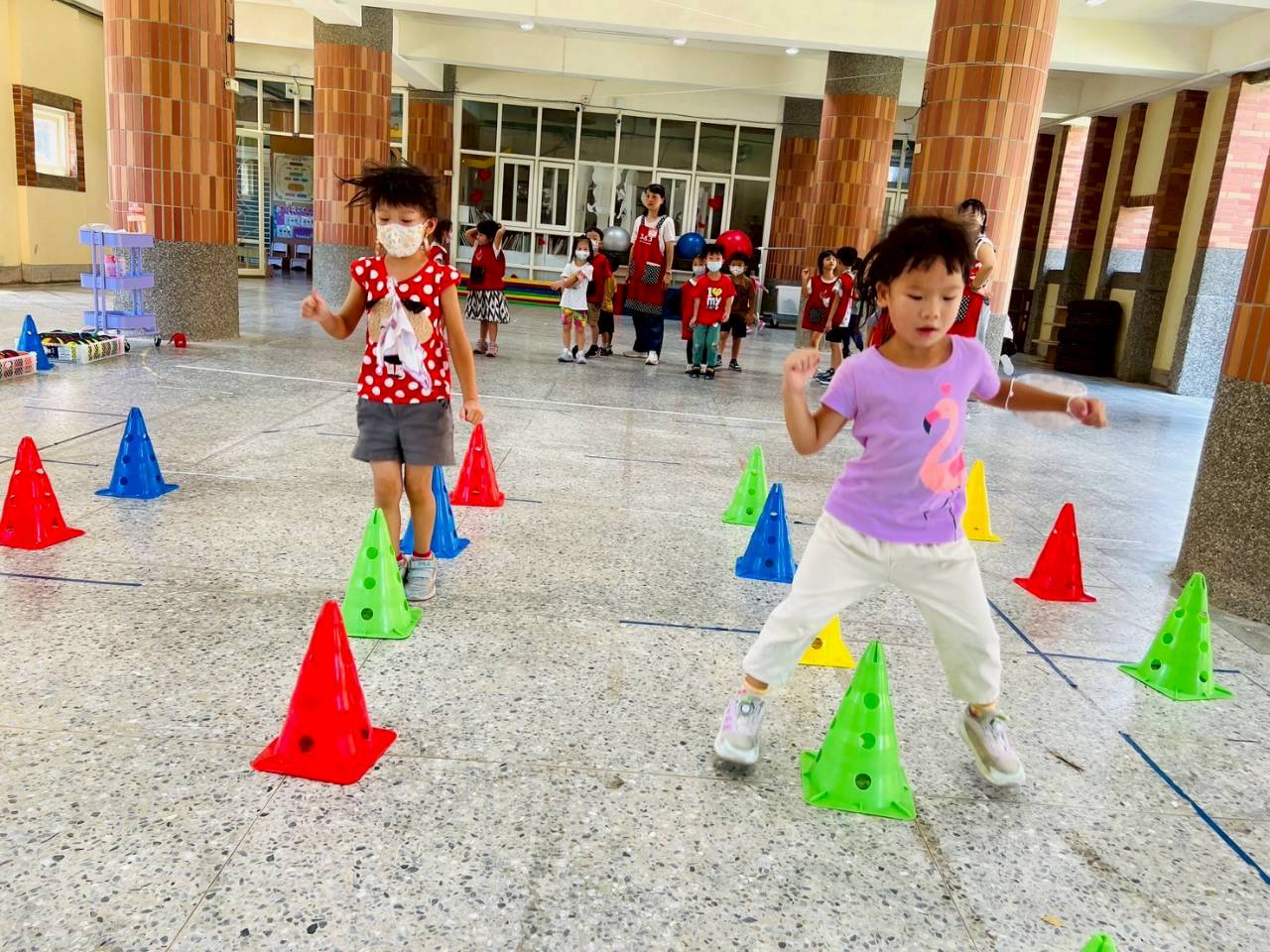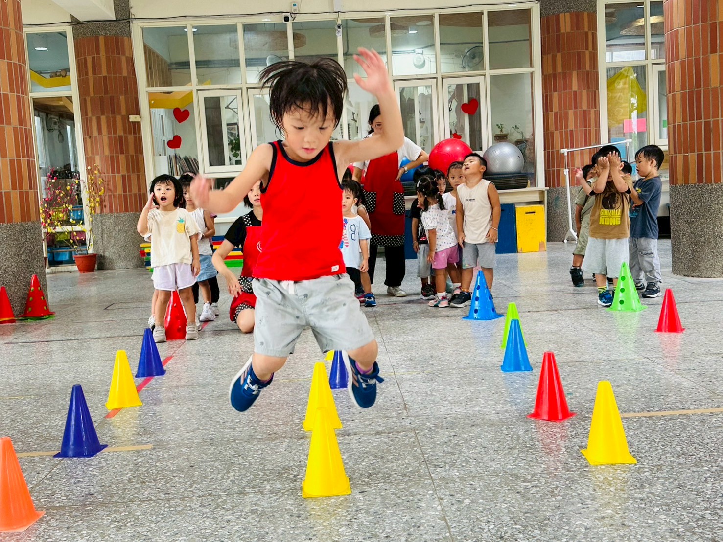 【冒險遊戲】以三角錐排放路線進行開合跳 ,s 形繞來回跑,訓練孩的專注力