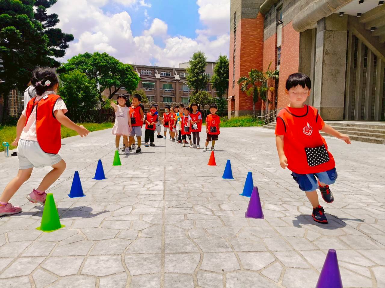 【單腳雙腳合作無間】折返跑到三角錐處,再往回跑,提升手眼協調的能力,並增進肢體動作和諧。