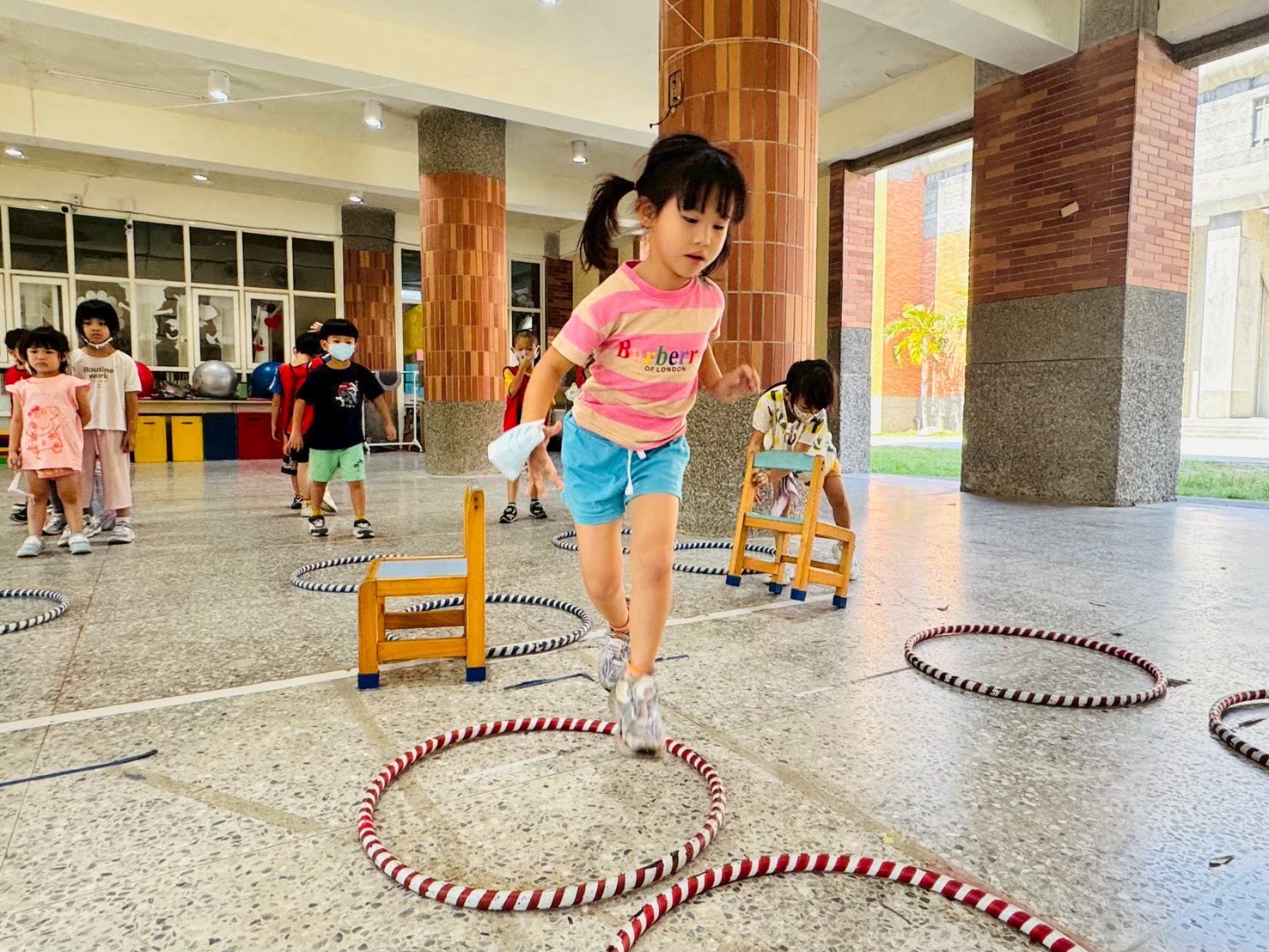 【唯我獨尊】踩高橇:踩著高橇走進呼啦圈,再走回去,訓練孩子的平衡能力,與提升身體平衡。