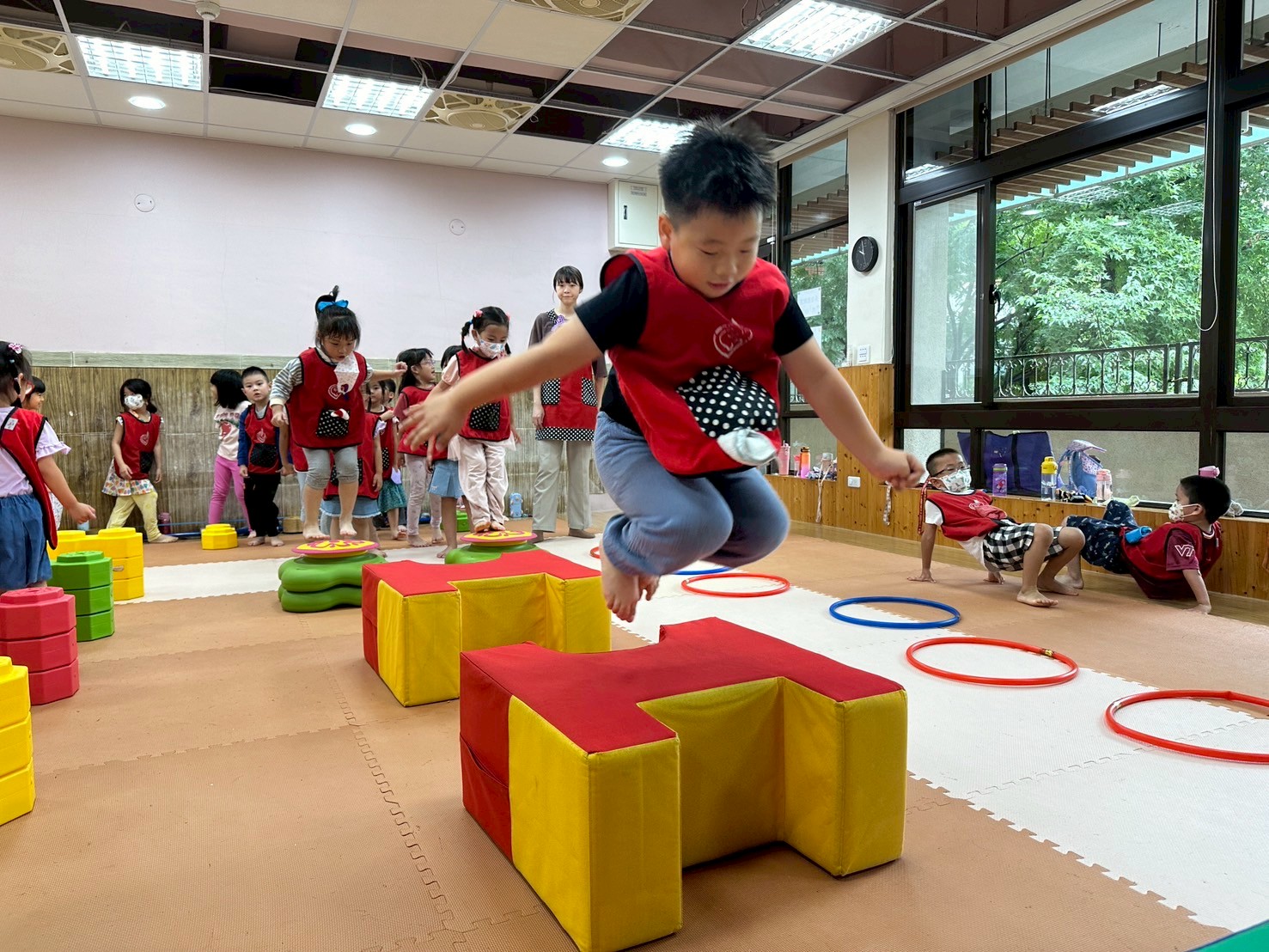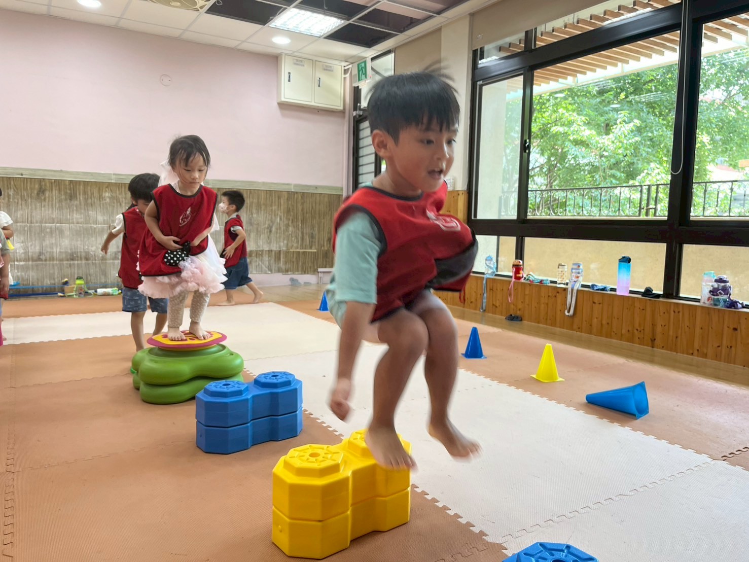 學期尾聲孩子們的爆發力增長許多,陪伴孩子挑戰難度較高的雙腳跳任務來更加提升審體的爆發力唷!