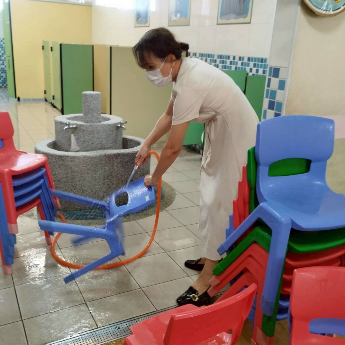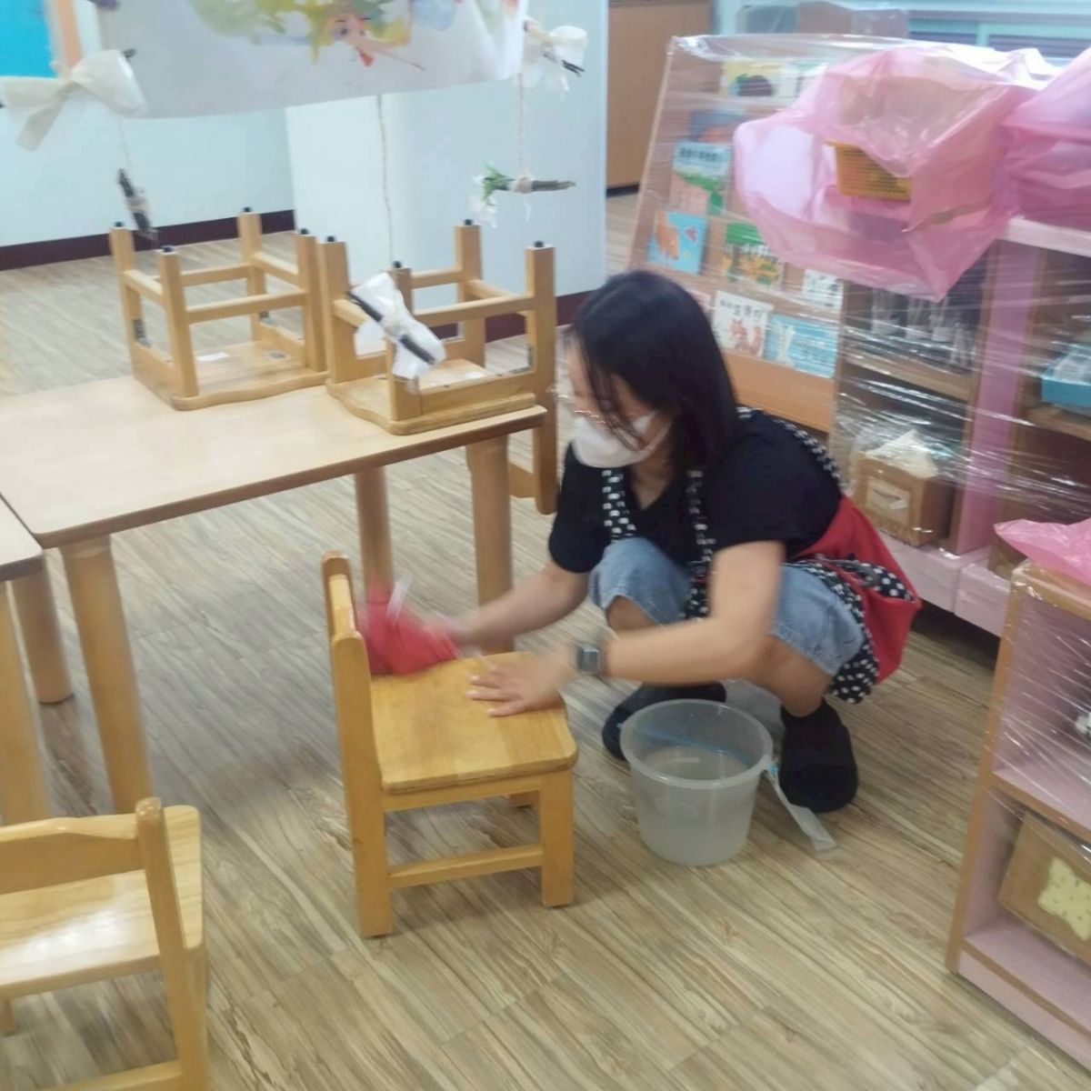 全園進行環境消毒,老師們認真清洗教玩具、打掃教室,確保孩子們擁有乾淨、安全的學習環境。