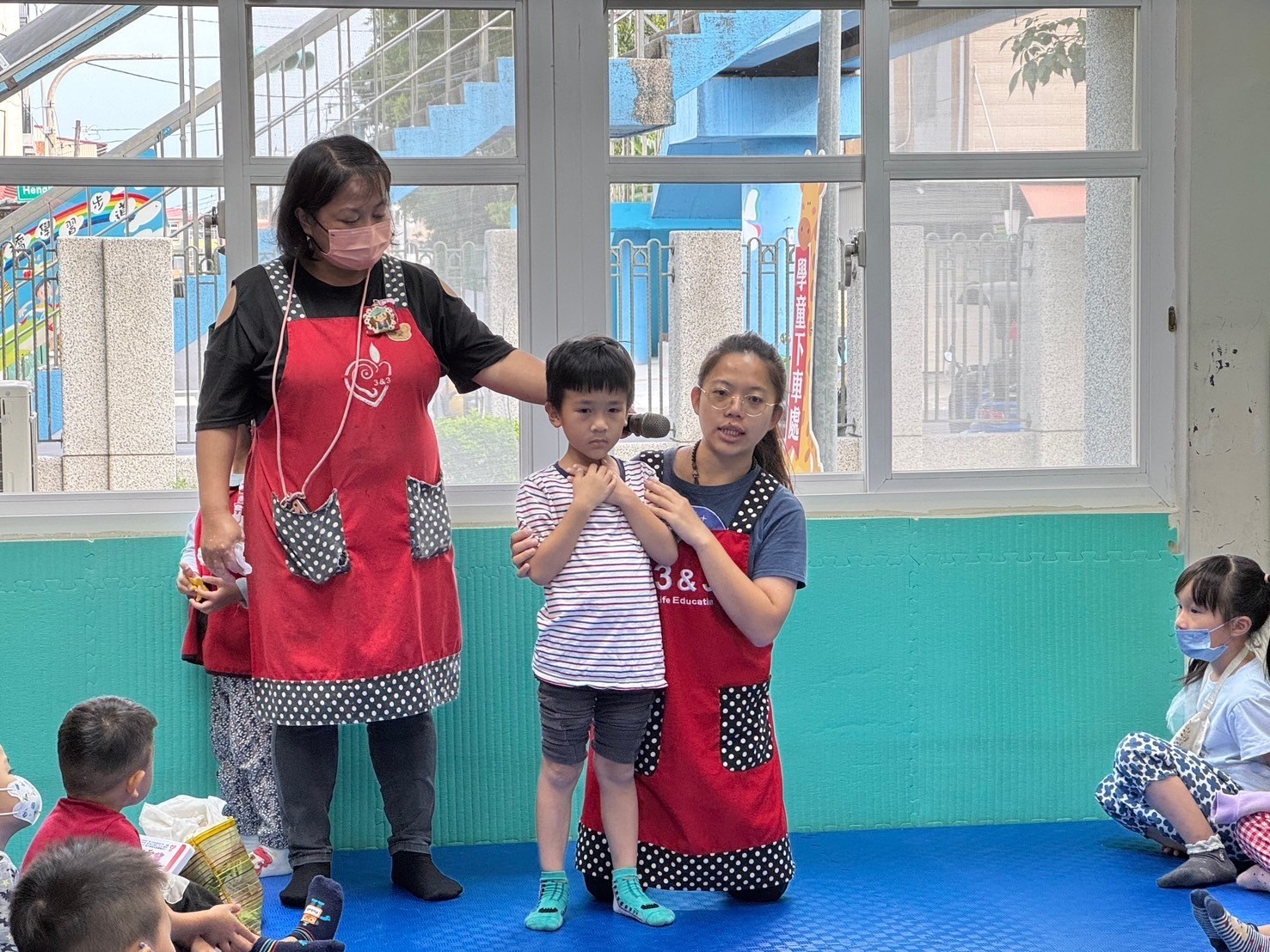 3.將兩底端繞經耳朵的上方到頭後枕骨 下方交錯,不要太緊,再繞回前額的中 央打結