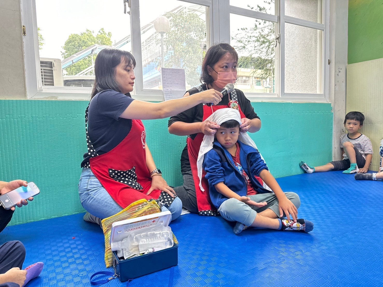 2.將三角巾底邊裹於前額靠眉處,使頂端 向後腦垂下