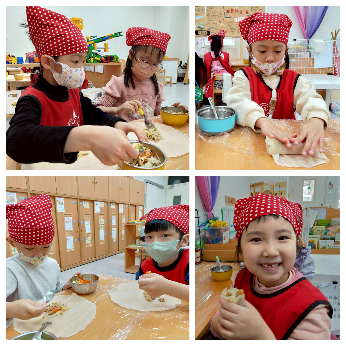 一早孩子興奮不已分享帶了什麼火鍋食材,在活動中,老師也帶入數數及認識蔬菜食物、更重要是訓練孩子手眼協調,今天是雙十好日子,大家圍爐吃火鍋,象徵過年闔家團圓,孩子也比平常多吃了好幾碗呢!