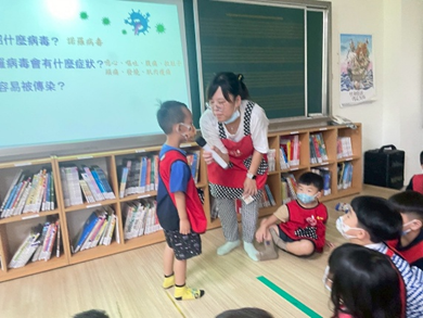 ▲請幼兒回答洗手的步驟。 ▲請幼兒說出感染病毒後有哪些症狀。