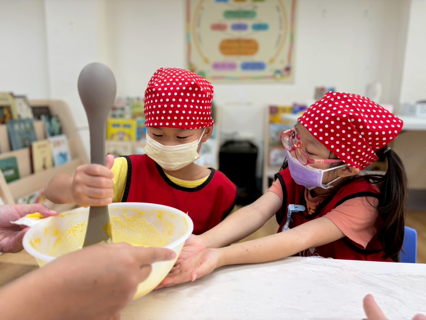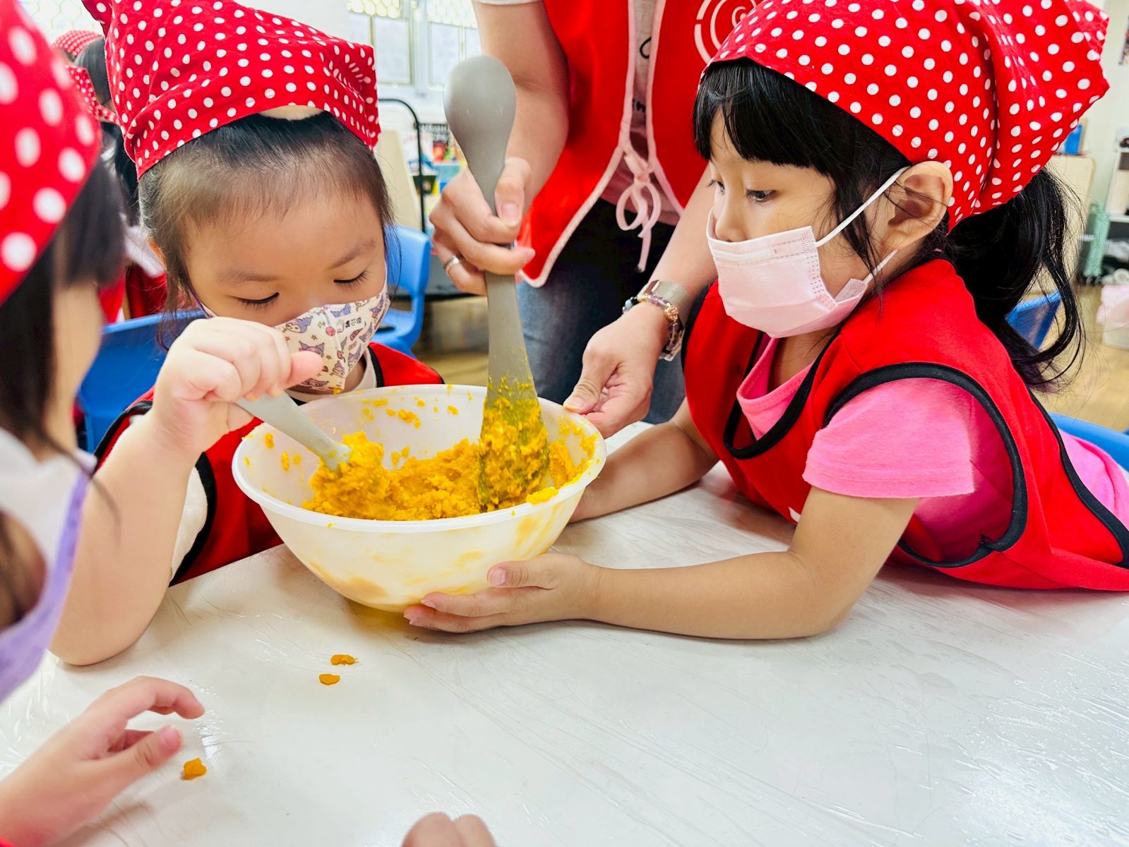 從觀察南瓜、倒入材料、攪拌混合,每一個步驟孩子們都充滿期待。