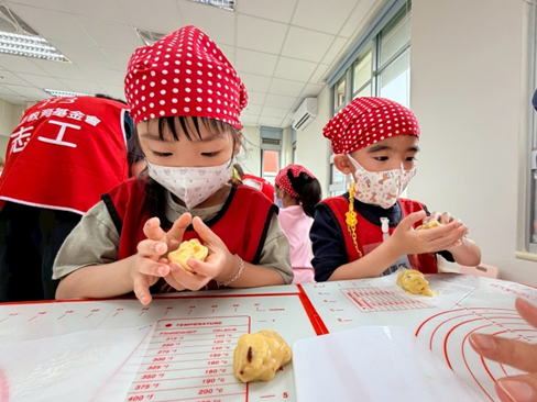 這學期的第一場烘焙活動,我們一起做了好多大朋友、小朋友在夜市喜歡吃的地瓜球喔!但是我們做的地瓜球和夜市賣的很不一樣喔!因為我們是用烤箱烤出來的QQ地瓜球,首先一樣先認識了我們當天會使用到的食材,聞一聞、看一看,再來分工合作將食材充分混合在大缸盆內,完成後的麵團搓圓後,塗上金黃的蛋液,就可以放進烤箱囉!