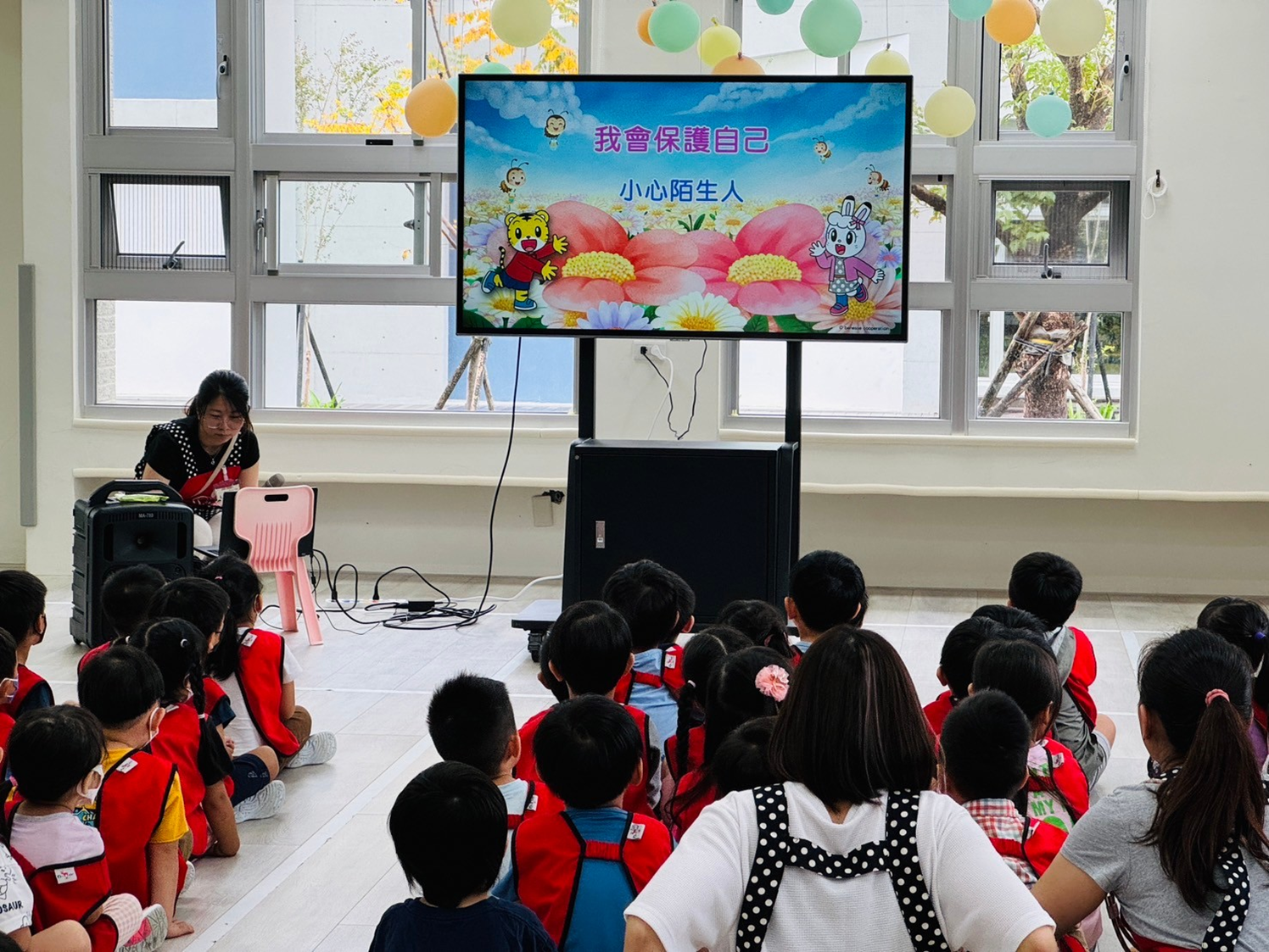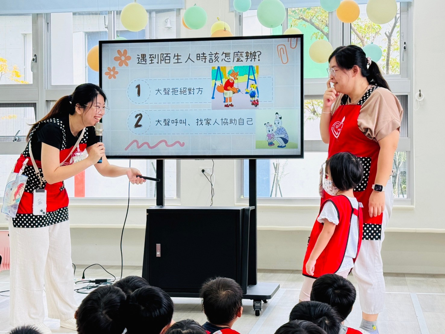 學校定期都會進行緊急救護情境演練,目的在於提高學校發生緊急情況時的應變能力,而這一次的主題設定為陌生人入侵校園時該怎麼辦,在全園性的安全宣導上,我們透過影片來認識當有陌生人要接近你時,可以大聲拒絕並找家長或老師協助,而透過師生共同演出的小戲劇,幼兒也都更能清楚知道該怎麼保護自己喔!最後實際進行全園性的情境演練,所有的老師和幼兒都可以確實的完成躲避的動作,也很感謝淡海國小的老師來協助演練喔!