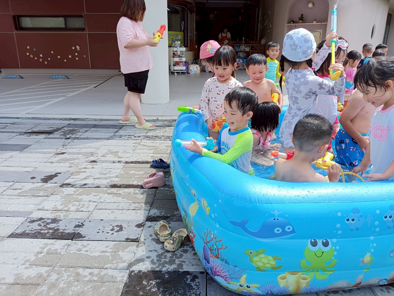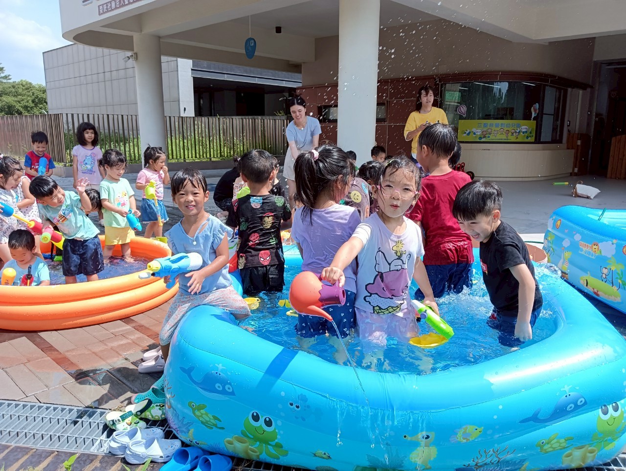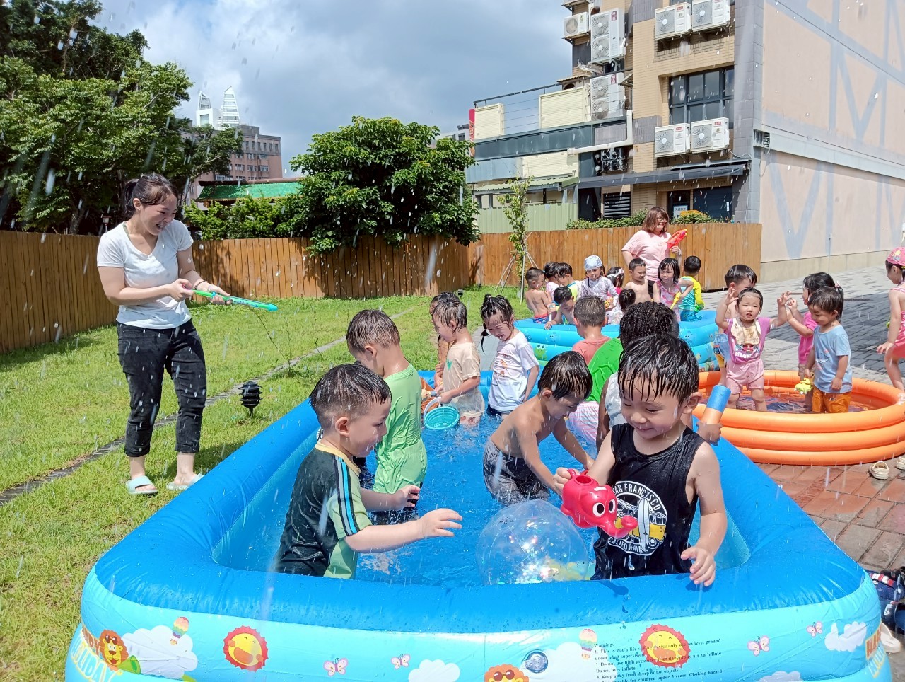 夏日陽光燦爛,小朋友們在清涼的水池中嬉戲玩耍,笑聲此起彼落,水花四濺,每個小臉蛋都洋溢著純真的快樂,彷彿整個夏天都被他們的歡笑染上了繽紛色彩。