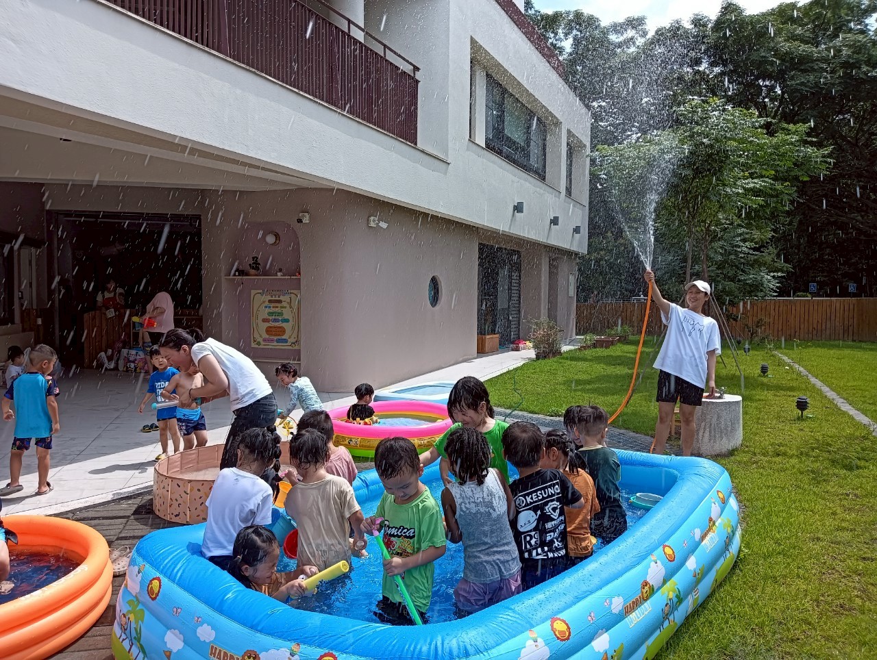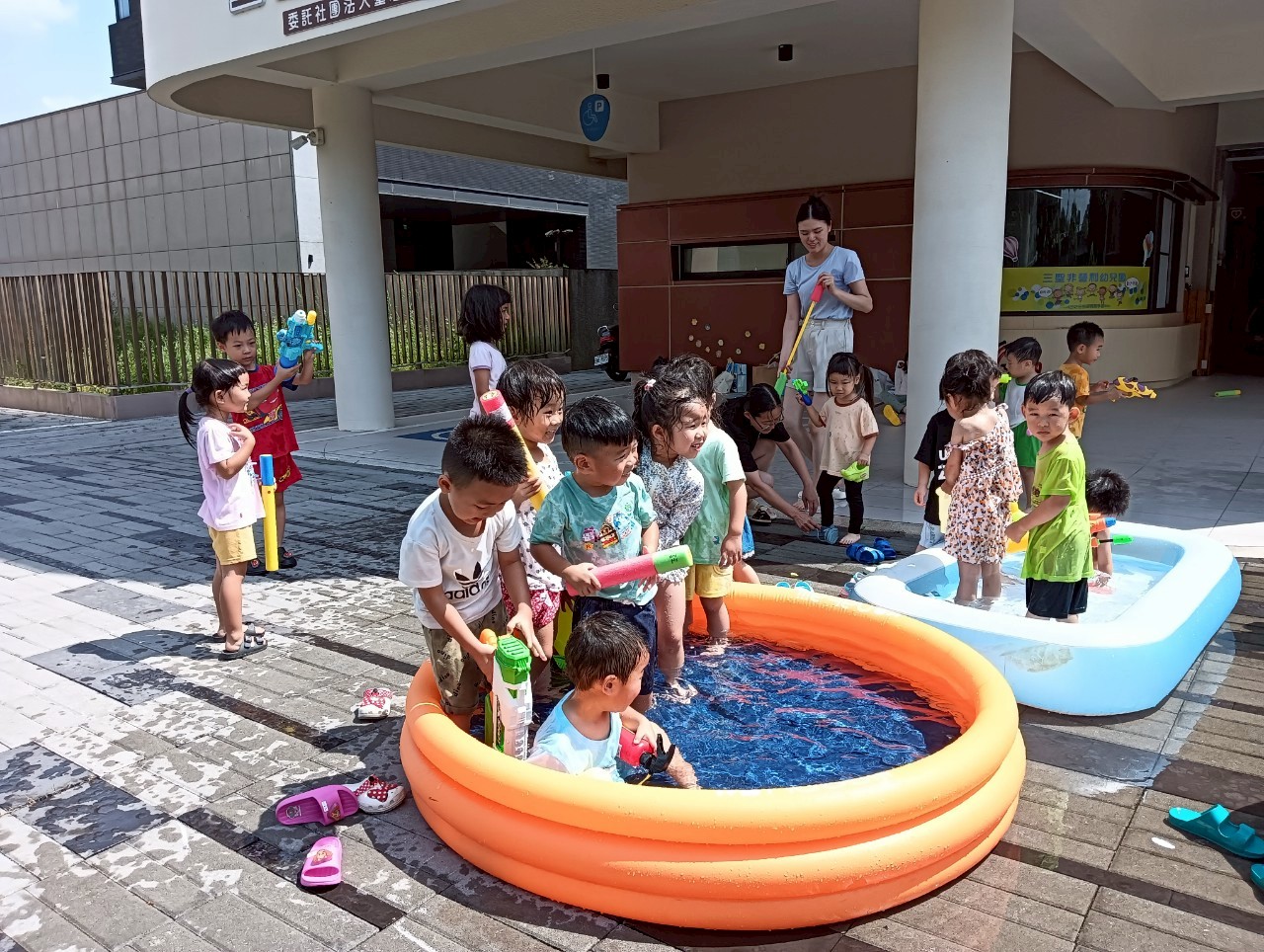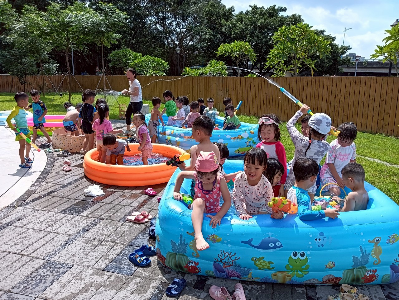 夏日陽光燦爛,小朋友們在清涼的水池中嬉戲玩耍,笑聲此起彼落,水花四濺,每個小臉蛋都洋溢著純真的快樂,彷彿整個夏天都被他們的歡笑染上了繽紛色彩。